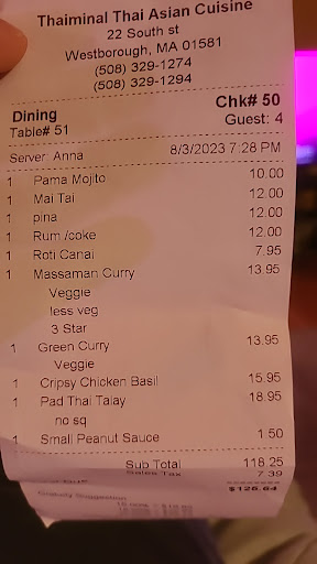Read moreDecided to try ordering lunch out at the newly opened Thaiminal in Westborough. It's in a quaint locality and has space for front parking. The restaurant was observing social distancing with signage to wear face masks and there was hand sanitizer available. Good customer service as the two lady staffers were friendly and chatty and ensured my order was correct and ready. The menu is pretty vast and prices are in the standard range. I only got the Pad Thai with crispy chicken for one. It's a good size portion that is very filling and could even be split between two. I've had my share of varying Pad Thai dishes at different eateries and can never find one that has that authentic flavor I'm looking for but this one is pretty close. Tasted great but would love to have had bigger chunks of fried egg, and more green onions, and bean...