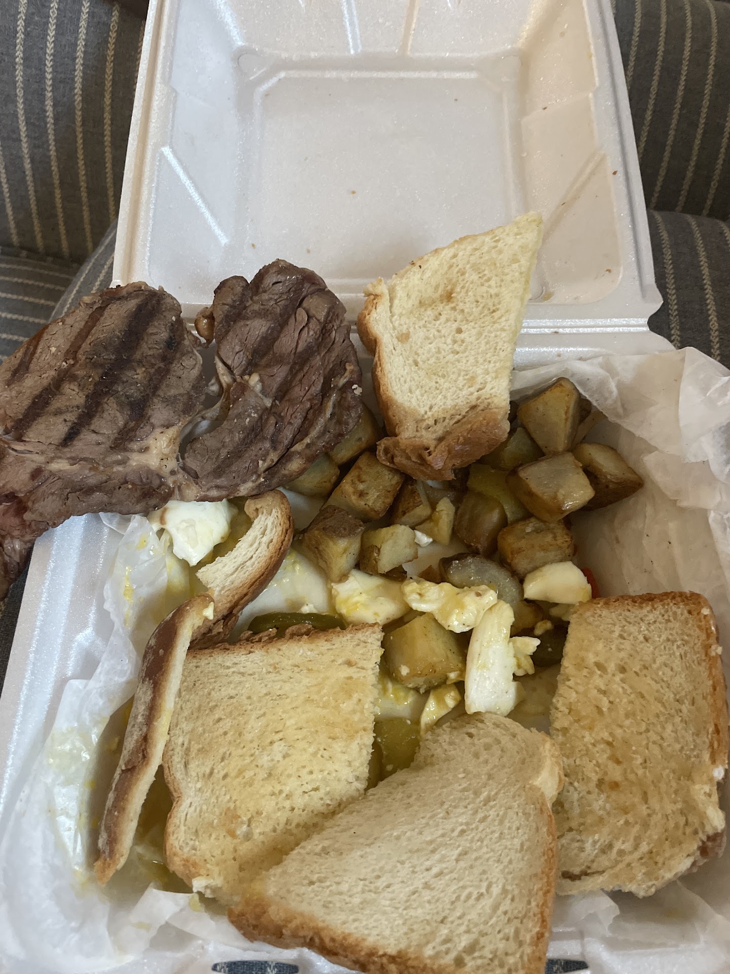 Worst food ever. Ordered steak medium rare got it well done and it’s also the thinnest steak I’ve ever seen. One egg was over cooked one egg was undercooked one egg was all I ate because that’s all I could stomach but I was hungry. The bread was super soggy, if it wasn’t for the faint toast marks I would’ve said that it wasn’t toasted at all and the crust was just ripped off of it and thrown around the box. The home fries that we didn’t know we’re included (and wish they weren’t) were under cooked and also had gross soggy sour tasting vegetables. We ordered mozzarella sticks and they were mostly just hollow shells of breading and grease. I ordered this through door dash and had to call the store 30 minutes after putting the order through because it wasn’t confirmed and I guess they had to reboot their system. The woman I spoke with was very nice but that cook should be fired. I’m also serve safe certified and this is the lowest quality of food that I’ve ever ordered from anywhere. I would’ve certainly gotten my moneys worth if I had just ordered from McDonald’s. My sister and I got the same thing so it’s everything times two. both of our orders were terrible. And it was over $60 minus the delivery fee. I’m glad I was able to post photos here because I was not on door dash. Thank goodness I was able to get a full refund on top of a $20 credit for the inconvenience...