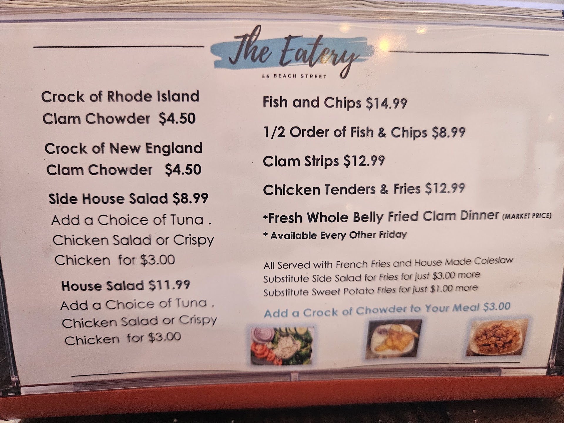 Read moreIf I could give infinity stars I would!! The service I received before I even walked in the door was impeccable!! Bryan, the owner is an absolute gem!! He greeted me with a friendly smile and had the door open for me to come in. We chatted for a bit and I can't say enough good things about him. This was my first time coming since it became The Eatery. I have always enjoyed fish and chips Fridays when it was Beach st Cafe. I didn't realize the tradition was continuing, I was ecstatic when I called and asked about it and they informed me that they still do it. Ok, now for the food review, I could of went on and on about the owner. The fish and chips were just as delicious as before, the only thing I believe changed are the fries, they aren't the seasoned ones from before but that's ok the fish alone is worth it and the chowder is absolutely delectable. Steve is missed, he was a wonderful guy. Bryan is top notch, I will definitely be returning! Thanks Bryan for the wonderful customer service and...