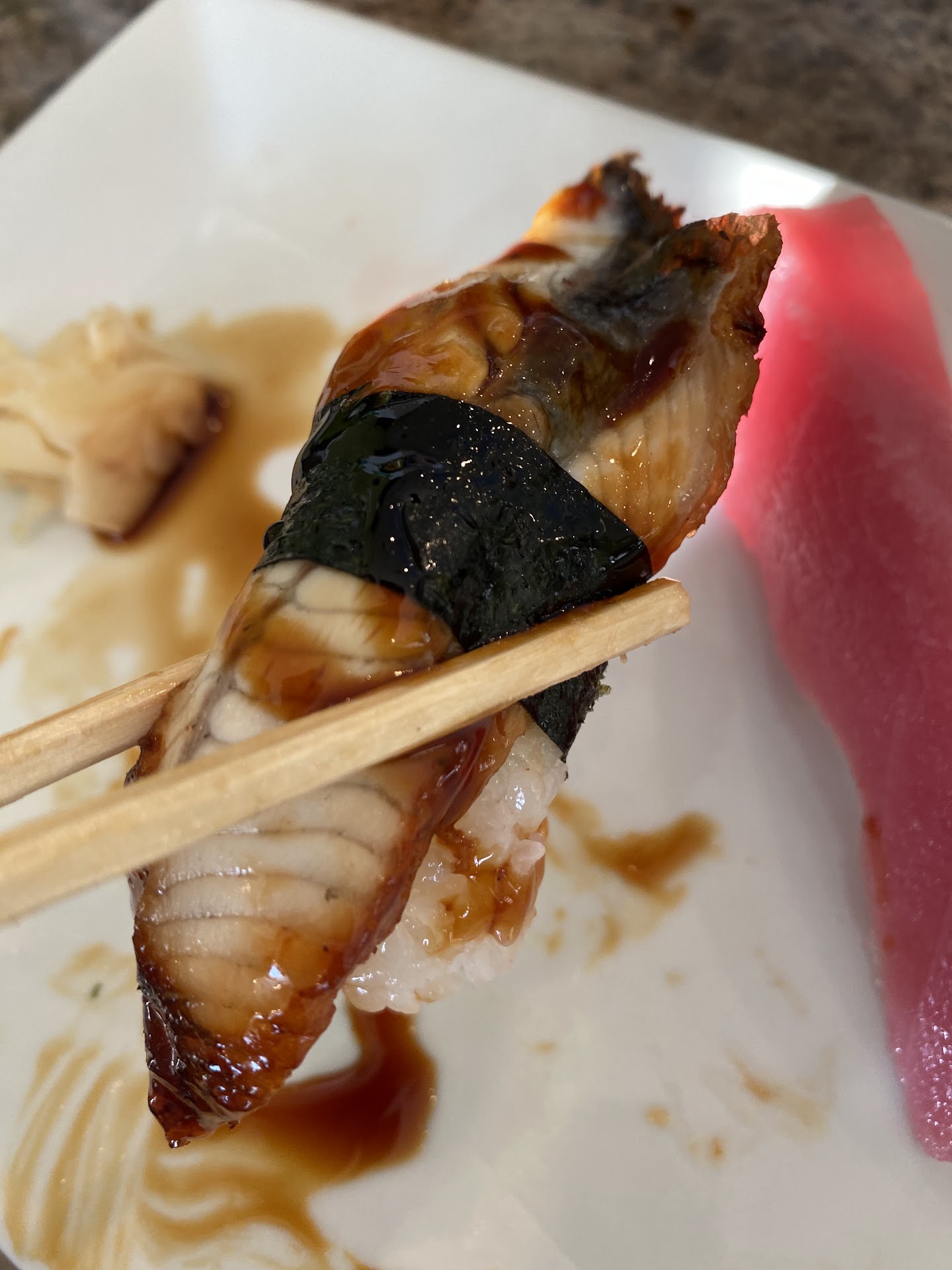 Flavor: The two roles we had were good. The ingredients were fresh. The rice was good, the ginger was fresh too. No complaints from the flavor at all. The rice (delicious remember) was a little thin on the roles. The portions were almost backwards, smaller amounts of rice, larger amounts of avocado, cucumber and crab. Not what I was expecting, happy surprise.