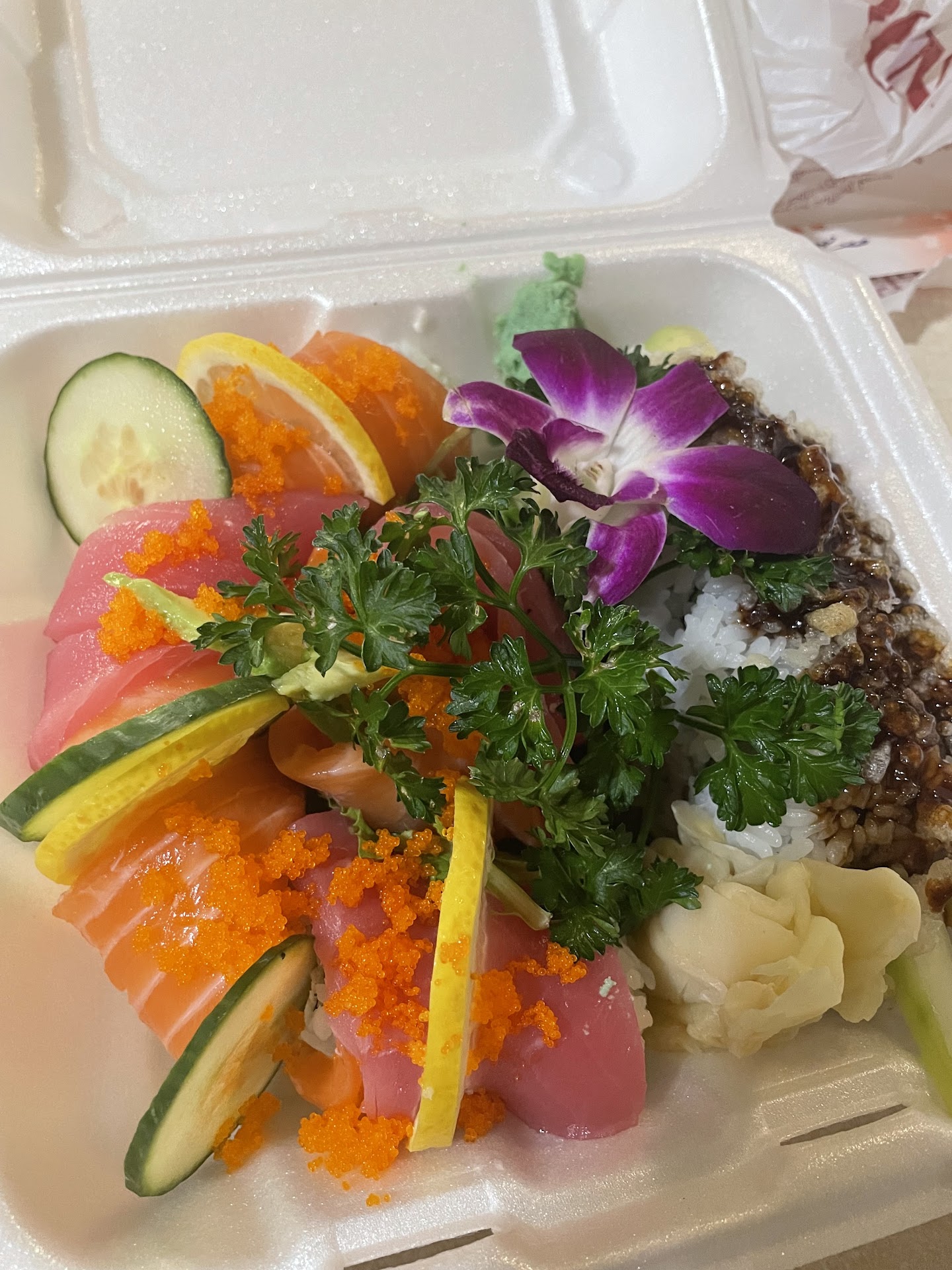 Presentation: The presentation was beautiful, 4 beautifully wrapped, cut, and topped roles (crunchy roles and yummy roles). In the center was a beautiful purple orchid bloom for added presentation (not a cheap flower at all). Garnishings of soy sauce, wasabi, and ginger spaced so not to touch (that's a big thing for me, I like to control the amount of wasabi on every piece). My yummy role was atop lettuce leaves so not to melt the container. I wish more places did this.