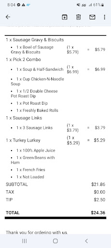 Read moreSimple order .. no substitutions... was literally the only person waiting for an order given the time I was scheduled to pick it up for to go.. to start they turn down someone with 20 years of professional and ownership in the restaurant service industry and cooking for a cooking position they have posted I inquire about which I completely understand due to my limited availability... but beyond that like I said given the time we were literally THE ONLY ORDER.. I arrived 15 minutes before my schedule time just to be early and ready for it fresh only to find it sitting on the counter waiting for me already without any heating lights or anything..my mistake I didn't double check my order but I didn't, only to get home to not have my green beans, had carrots instead , No biscuits for the sausage gravy , No rolls , and absolutely everything was COLD... NOT warm but COLD ... HIGHLY RECOMMEND NOT TO GO HERE MUCHLESS TIP UNTIL YOU KNOW YOUR ORDER IS CORRECT AND FRESH ... if they were slammed I could understand this happening but having 4 people there in the front including Alex the manager and 0 I repeat ZERO PEOPLE THERE to take care of ,they still screwed my order up this bad !!!! You all need much more HELP than just cooks ... 🤦♂️ very sad this is what Bob Evans has come to... I'm actually grateful she said with my ridiculous availability that it wouldn't work out cooking there ... As a food truck and catering company owner ,I absolutely would not stand for something like this in my kitchen when there 1 order to get CORRECT...