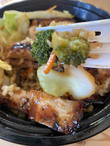 We each got the chicken breast teriyaki bowl. I had to stop eating the vegetables because they tasted like they had some preservatives on them. I'm used to fresh well rinsed Asian vegetables and these did not meet the expectation. The chicken breast was a good enough portion, a little dry. Lots and lots of rice fill the bowl. I had brown and my husband had white. There are a lot of upsell items.