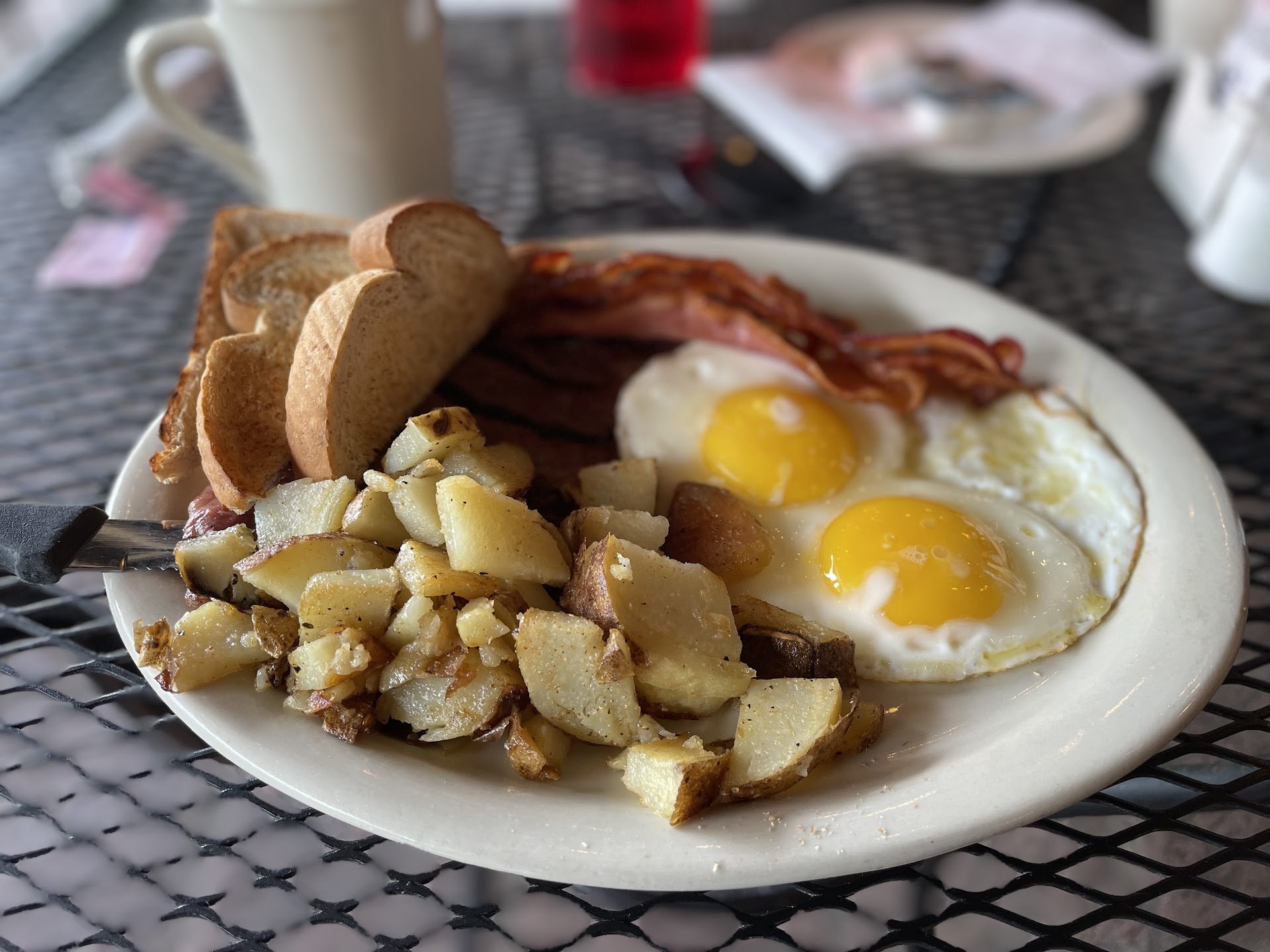 I have since returned on several occasions to the same good diner food, and service. I did have a corned beef hash. No they do not dump it out of a can. They do however use their homemade corned beef. Grilled, mixed, seasoned, and worth a try. They have daily specials which now include 3 hash’s(see pics) I’ve tried here. I would prefer more seasoning, but that would not please everyone. Omelettes(see pic) are stuffed. Pancakes(see pic) are huge and light. If you add blueberries or chocolate chips, you are going to be ecstatic at the abundance. LOL the blueberries were so juicy that they squirted onto the front window. Great staff, and great breakfast menu. See more pics at...