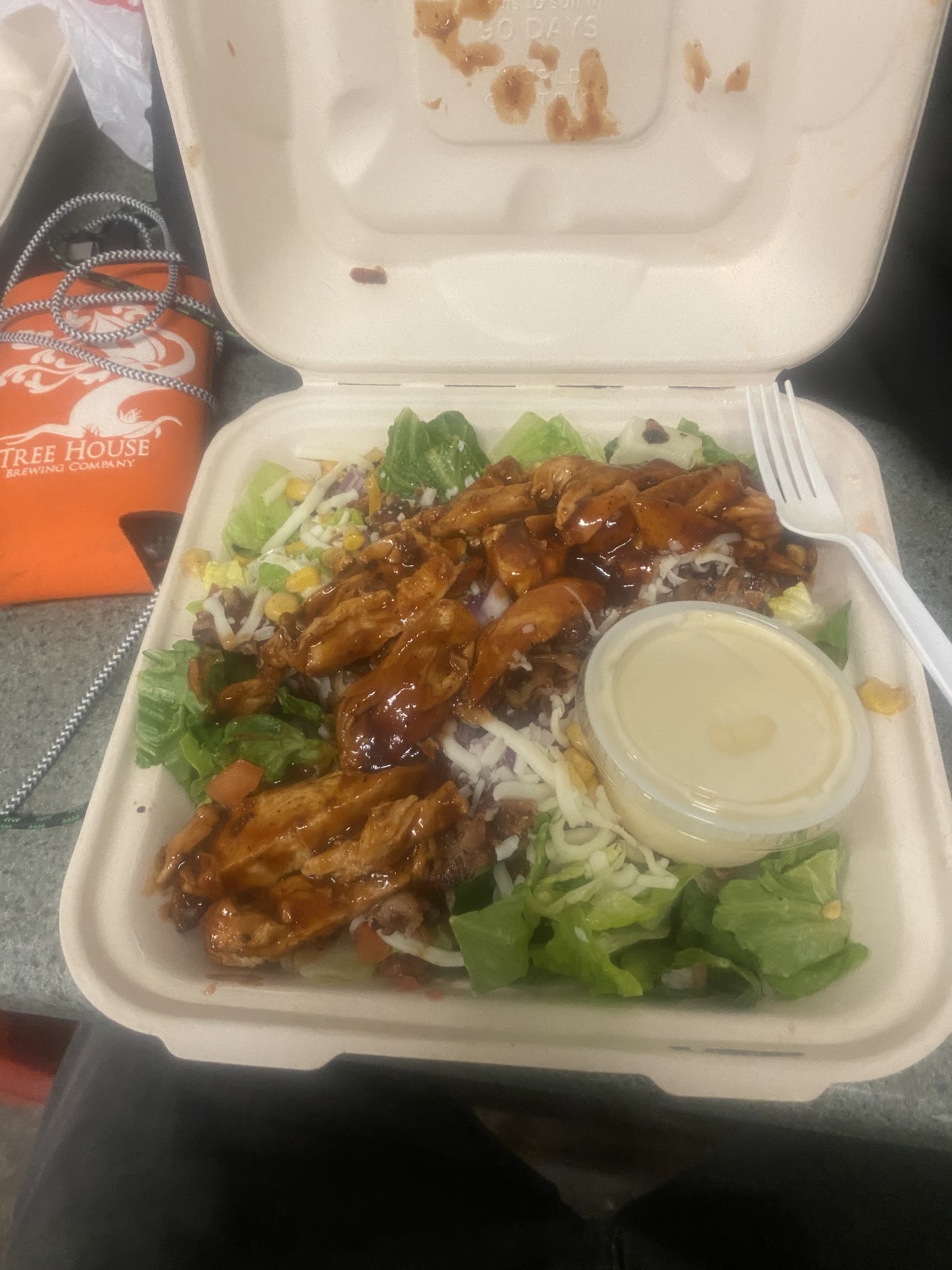 The service was also a positive. I ordered to-go and they forgot the dressing, the bbq sauce on the chicken, AND the silverware. These things happen at a busy Bar and Grille. I went straight back to work so providing my own fork or dressing wasn’t possible once I discovered this.