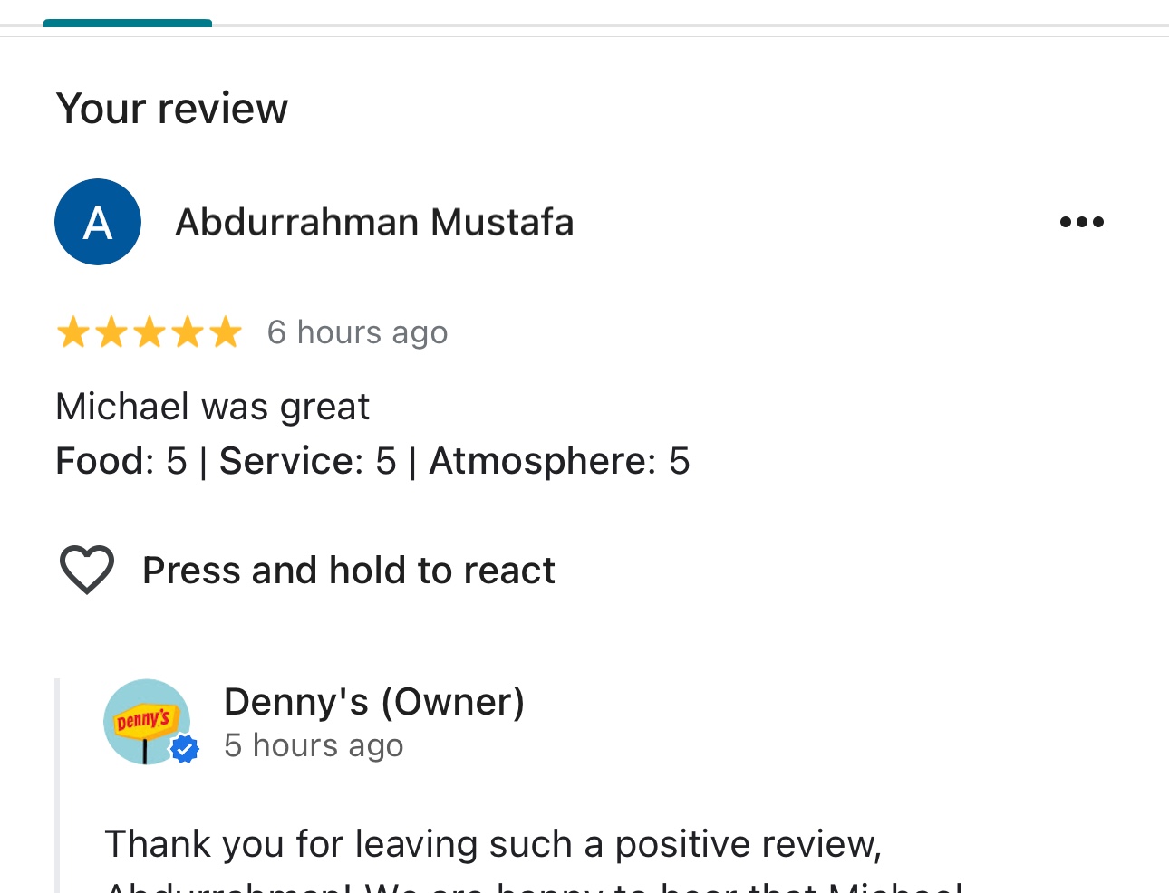 I came in to Denny’s and was waiting for someone to see me. Hey gentleman name, Mike Miller was checking out some guests. He saw me, but never acknowledged my presence by saying he would be with me in just a moment. Instead when he was complete With the checkout, he asked me are you picking up food for Uber? I said why would I be picking up food? He said oh I don’t know. He was racially profiling me White. After another lady sent me, he came by and I could hear him whispering under his breath and I said what are you talking about? He then started to verbally threaten me and told me to shut up and if I have a problem with it, she could step outside with me and and take care of it. So I’m being physically threatened at this point he then went to his manager and lied to her about me racially profiling him for some reason and then said I had physically assaulted him after she told him to kick me out of the restaurant, he proceeded to grab over my shoulder and hit me on the neck and shoulder with his arm to grab my menus. I would not let him have them so he grabbed my phone and threw it down the counter. I was then told by the manager to get Out of the restaurant. After I called corporate and they looked at the cameras and saw that I was physically assaulted and my personal Possessions were battered. He was let go. The manager still being there has not been reprimanded. Her name is Donna. This is not a family environment any longer. This is a hiring of people that look like they just got out of prison with tattoos all over their neck and face and arms. I think this is a horrible representation of family diner or environment for...