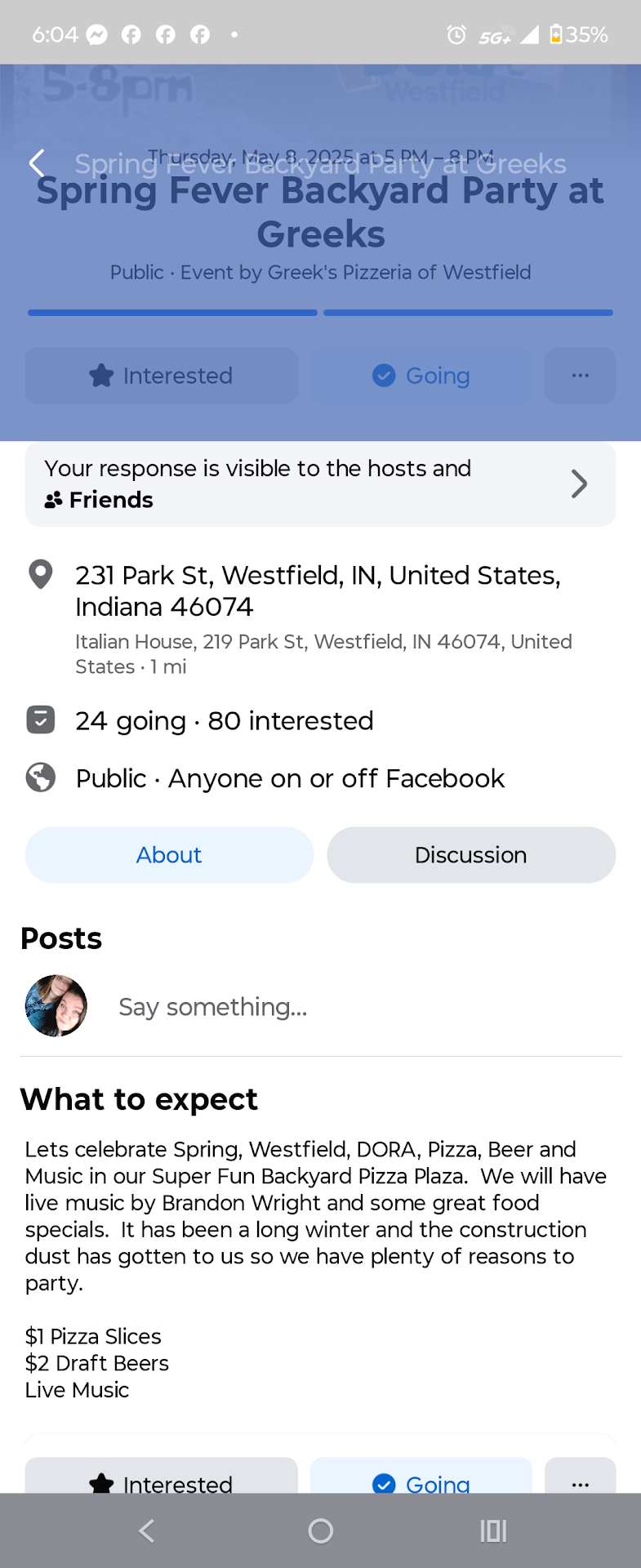 Ā Ā Ā Read moreBrought my kids here for an event posted on Facebook. Upon getting to the restaurant I'm told this event "Spring Fever Backyard Party at Greeks" advertised on Facebook was cancelled and they are not honoring the $1 pizza slices and $1 beers advertised, but that we were welcome to eat here at normal menu prices. Several people came in after myself for the same event. They have been notified several times by myself and other people who have come in after me for the event that the event is STILL up on Facebook and Instagram with no notification of the event cancellation for incoming customers. They have no intention of taking down the event from their social media pages or posting about the cancellation and everyone working in the restaurant claims it was the "owners" decision none of them "know anything" and they do not have a business card or email to reach out to the owner. Aka.. they are doing nothing about it and not honoring the pricing...