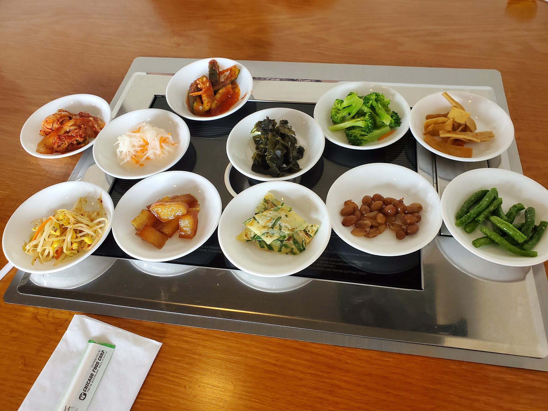 The lunch special portion comes with abundant Korean side dishes which today were: 1) delicious kimchee, 2)delicate fried green beans with light sesame oil, 3) Cucumber kimchi, 4) omook, 5) slices of buchujeon (chive pancake), 6) special, slightly sweet peanuts in lite soy sauce 7) bean sprouts 8) sweet vinegary kelp 9) lite sweet soy saucy cubed potatoes 10) fresh, lightly sesame oil broccoli 11) sweet shredded radish- like dish