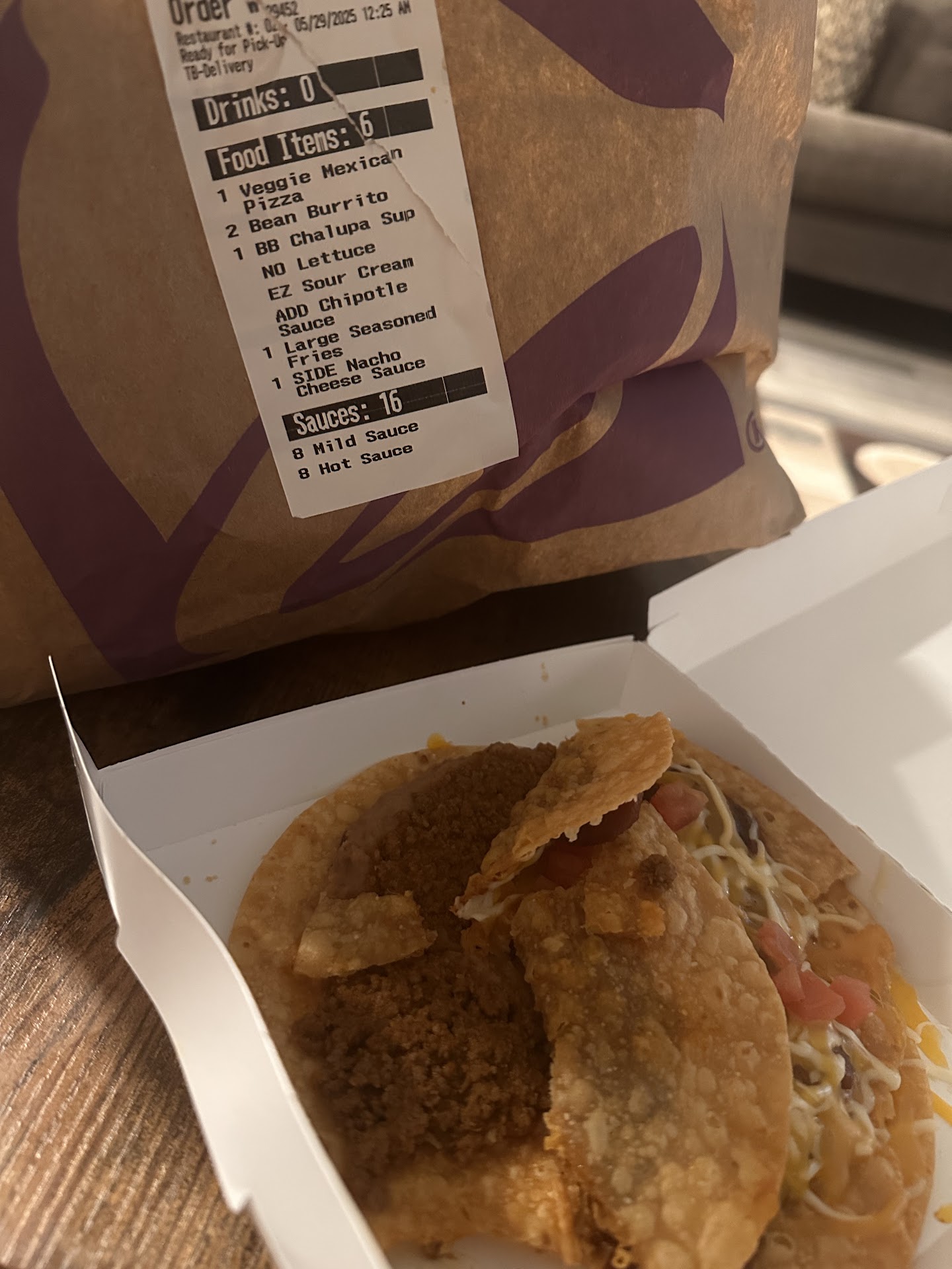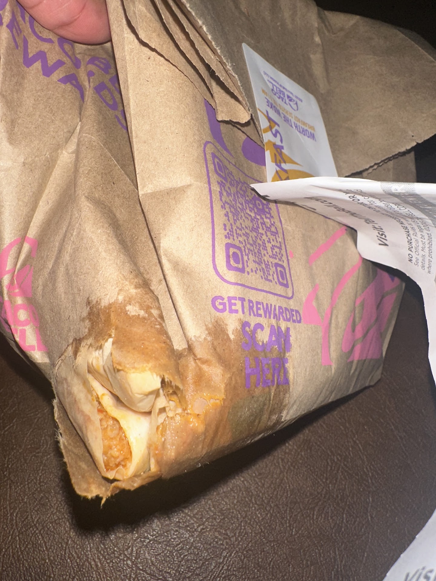 Read moreReplaced an order on the internet app went to the order window and was immediately told they were out of meet and we told them that we had a order already put in we pulled forward she gave us a soda and a bag of cinnamon twists and said thank you. We said no no we ordered a bunch of food and she said we're out of meat and we said we didn't order anything with meat we ordered black beans with our meal. She left the window then return to us and asked what did we order again we gave her the name that was placed online with and she said oh okay. She went back came to the window with a bag of food. We again said that we ordered stuff with black beans. As soon as we pulled away my daughter was going through the bag and counted the items and they were correct however we got three gorditas and instead of two gorditas and a crunchwrap. Once we got home they all had meat in them so this was clearly made prior to us coming there because it was clearly with me that they immediately told us that they were out of. It was soggy disgusting gross and horrible tasting. Never will I go...