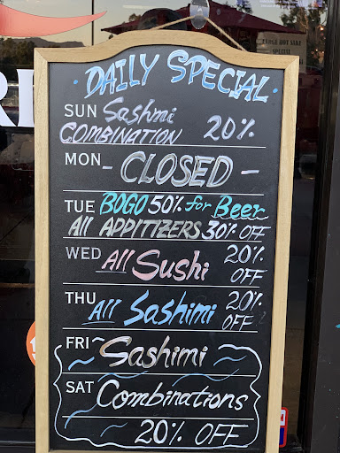 Read moreWARNING: Bait-and-switch practices! The restaurant posts daily specials in its window and at its tables. We dined here on a Wednesday night when the sign read, "Wednesday: All Sushi 20% Off." In fact, that is what brought us in. We ordered all sushi. Our first check had no discount. I pointed this out to our server, but our revised check came back with only about a 10% discount. Our server explained that the special only applies to nigiri sushi, not to the maki rolls we ordered. (In what world does "All Sushi" mean "some sushi"?) I then talked to the manager who declined to make things right for us and instead repeated the policy. This is bad business and sneaky. The owner does not understand that building trust with your patrons pays back dividends in loyalty. You got us for one meal, but you lost the rest of our business. And we live local and dine local every week, and we share our dining recommendations with friends...