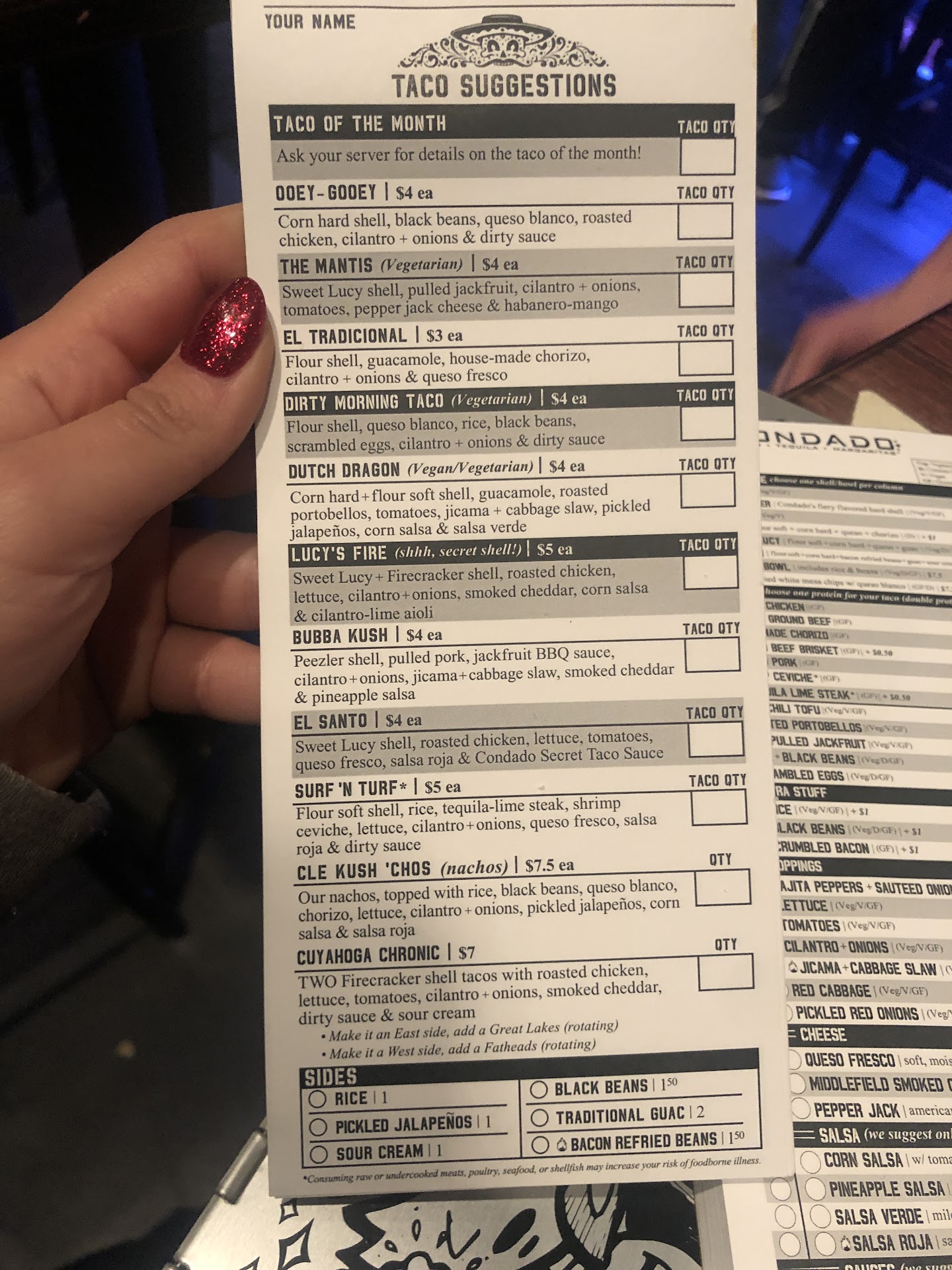 Read moreWe had such a good time! It was our first visit and although I'm a taco freak who will try anything, hubby is a bit more simple. The atmosphere was fun with vibrant colored walls. It was small but it wasn't crowded to where you were eating with the people at the next table. The choices for seating was great too. Physically I am unable to sit on a stool or a high top table so having the option was nice. Patio seating was an option and that's where we chose to sit. It was a nice day and did start to cool down a bit but there were patio heaters for those kind of days. Not today but it was really nice when we got there.