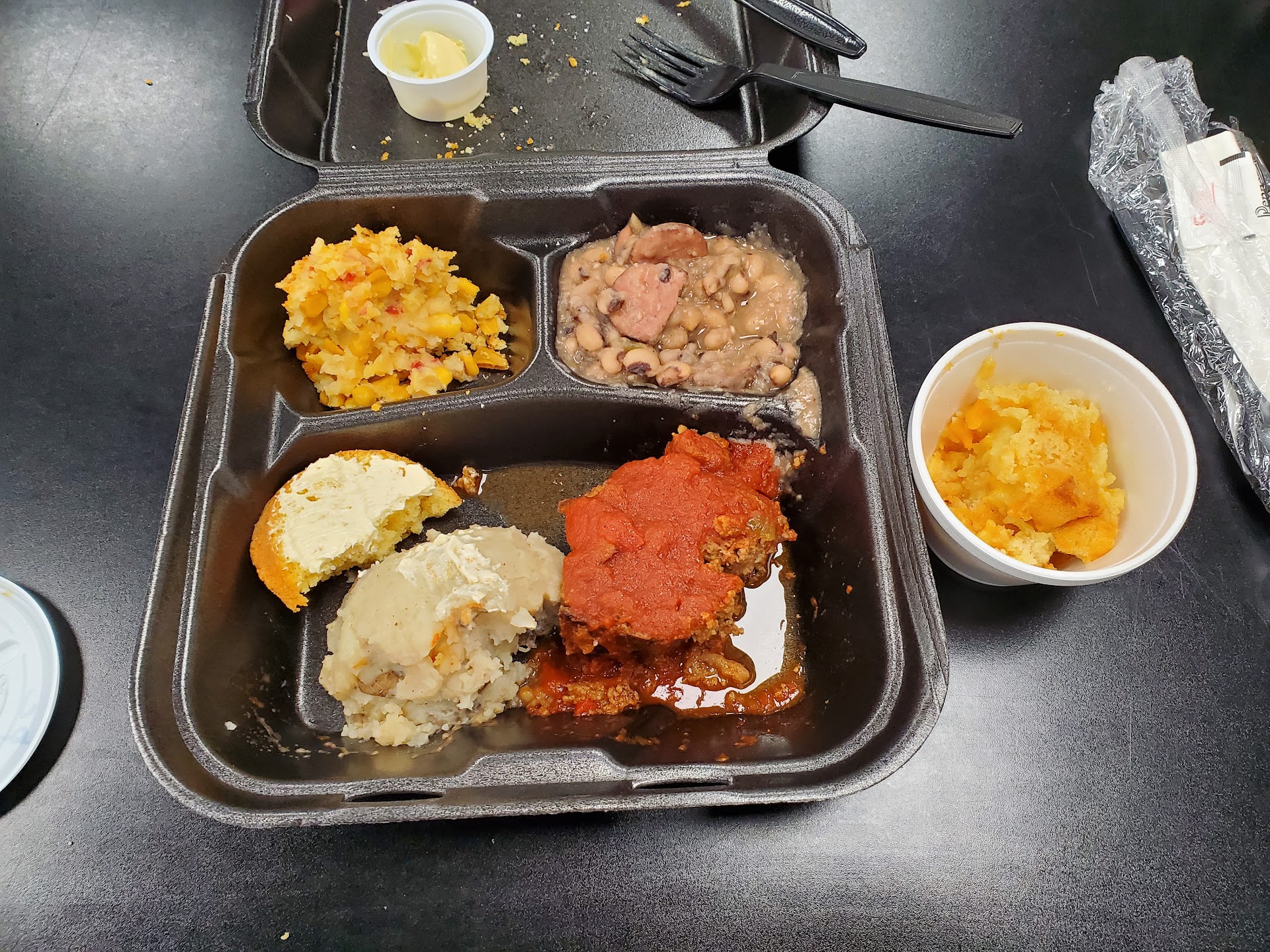 JANUARY 2025 - One of our favorite places to eat in our area. Pasta & shrimp, cooked cabbage, and black-eyed peas today plate lunch was so DELICIOUS! My current wife had the fried fish, cucumber & tomatoe salad, and French fries with hush puppies were also delicious. Plate lunches are loaded, and we have plenty for supper!!! Also, Richard is a big McNeese Cowboy supporter, too.