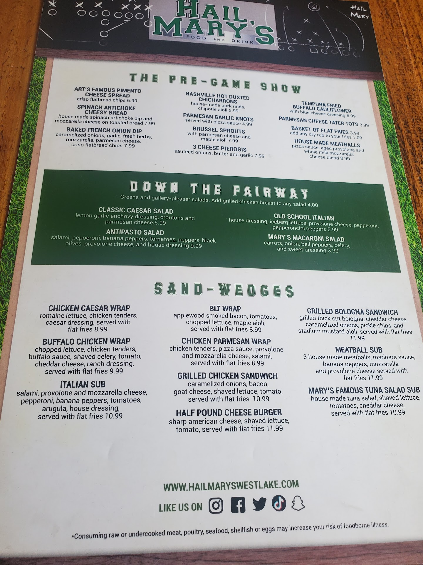 Read morelet me start by saying i don't ever feel called to write a review unless i am blown away. in this particular case i was blown away by just how awful this place was. my group and i sat inside yet we killed not one, not two, but FIVE bees that swarmed our table throughout the meal. the service was absolutely awful. the food took almost an hour to come out even though there was only one other two top inside. i also am no stranger to the stress of restaurants being understaffed as i have personally worked in food service. that was clearly not the issue here. the fries came out soggy and cold. the chicken was flavorless and greasy as was the pizza, and i never once got asked for a refill. i fully understand the kind of restaurant hail mary's is intended to be (game day pub, and easy bar food), but if you're going to serve, serve well. period. all that being said, for the quality of the food, the bill was entirely too high. there were two upsides to this place. their music choice and their lemonade. i truly love supporting local and small businesses more than anything in this world, and i don't write this review to drive away customers and take away money from this place. i just simply wanted to share...