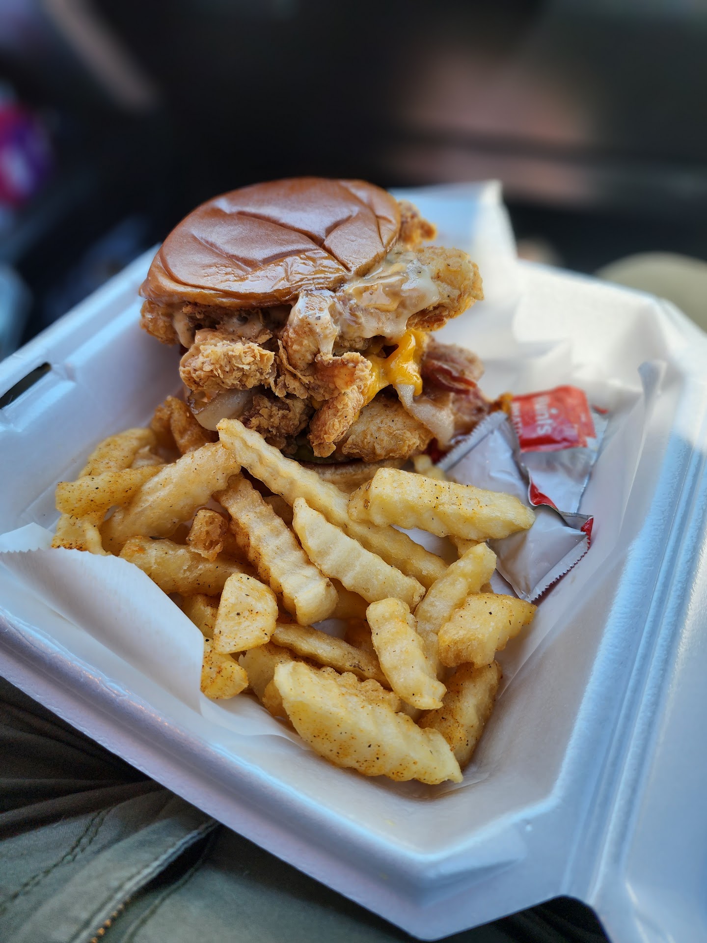On the buttered brioche bun sat a juicy seasoned beef patty, chopped chicken and thick cut bacon! The beef, pork and chicken combination blended well! All of this meat was topped with pickles, three cheeses and a special secret sauce. Every part of this meal contributed to the unique delicious flavor. The seasoned fries were fresh as usual.