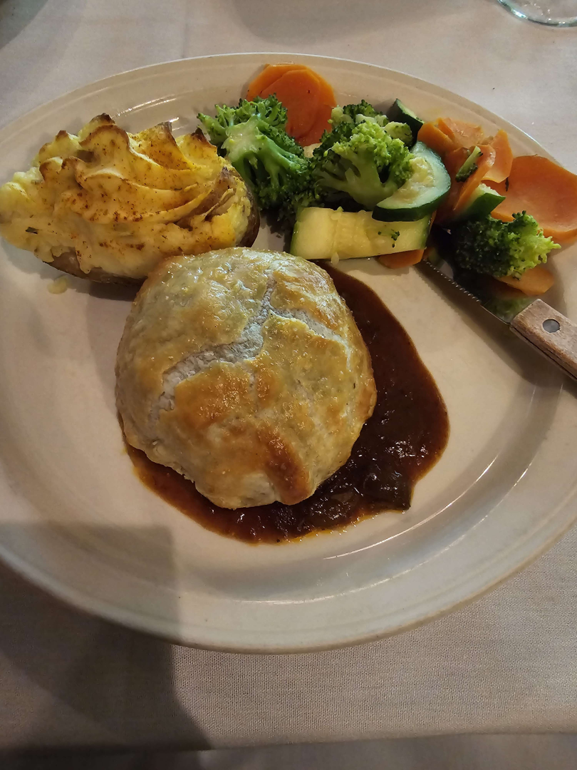 FOOD: My husband had the Prime Rib and I had the Beef Wellington. We started off with 2 cocktails, a Moscow Mule and a White Russian. Both were good. We had a small basket of bread & butter which was fine. Dinner salads were small, standard fare. The Prime Rib was medium rare, as it should be, but it was barely lukewarm. It was accompanied by a twice baked potato and some steamed vegetables. The twice baked potato was so TINY. It was half of a very small potato and, again, barely warm. I couldn't tell if the vegetables were frozen or not. Either way, they were just standard--nothing special. The Beef Wellington was...well, it just WAS. The pastry was soggy and it was barely warm. It was just mush surrounding a piece of meat. The filet instead was good. It cut like butter, but, it just wasn't warm. A good piece of meat ruined by its surroundings. My dish had the same sides as the Prime Rib. A very small, twice baked potato and vegetables. We opted to skip dessert because the meal was so disappointing.