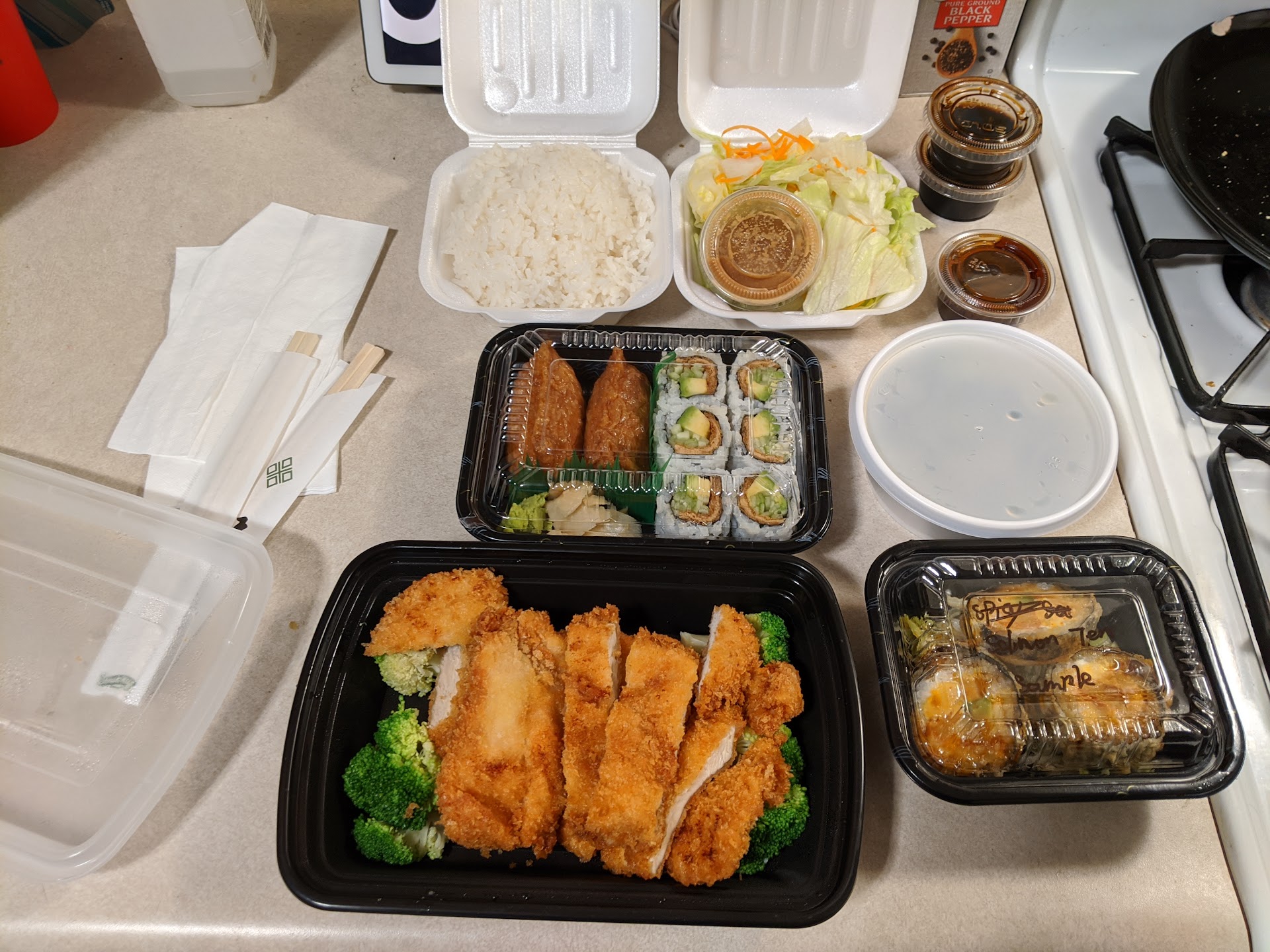 I ordered the chicken katsu which came with salad, miso soup, and rice. It was delicious and delightfully crispy. I also ordered some inari sushi and the sweet vegetable roll which were very tasty. When the employee brought my food she let me know the sushi chef also included a sample for me to try out. It was a salmon tempura roll and I quite enjoyed it.