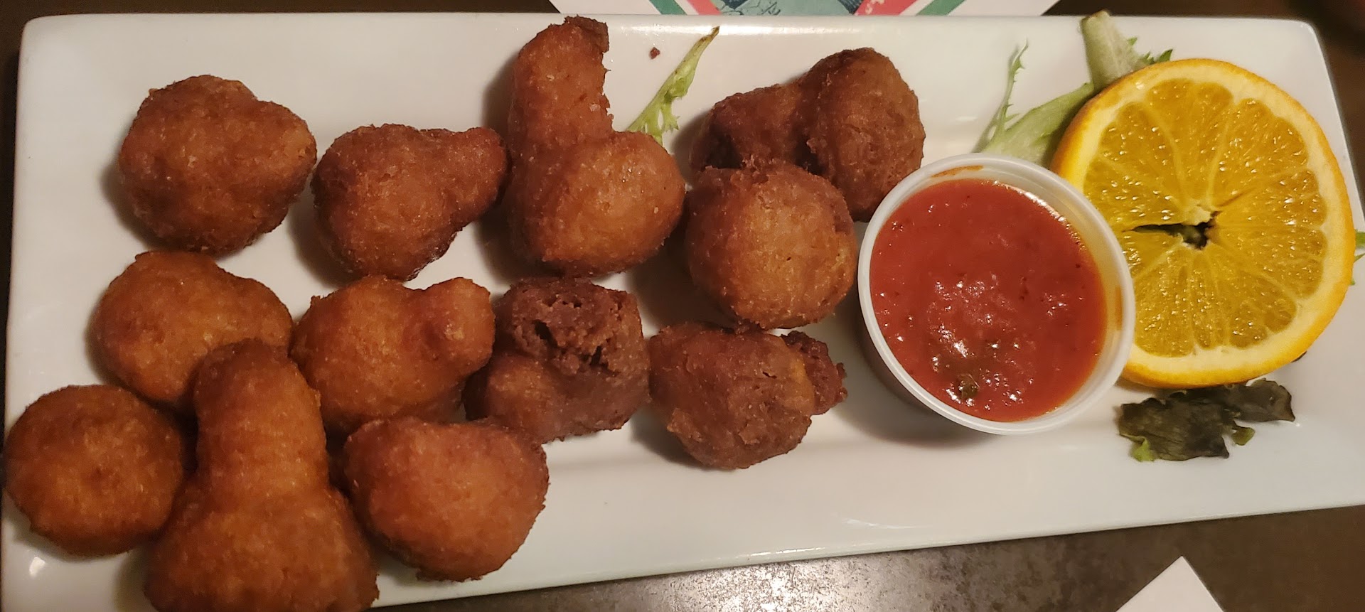 Food, sirloin steak very tasty, cooked perfectly medium rare,, baked potato hot.. shrimp Alfredo tasty but barely warm.. would have given 4 stars .. But..Tried to make make a reservation online and restaurant declined, email reply said only reservations for 8 or more .. "Angelo Brothers Ristorante & Banquet Hall doesn't take reservations for parties smaller than 8. If you'd like to walk in, the restaurant doesn't expect a wait time at 7:30 PM for a group of 2." Our experience, walked in, hostess didn't acknowledge us until after she cashed out someone, got a pizza and took payment from someone else telling `Their salad would be out shortly' .. then after their salad came out, she finaly addressed us.. telling us it would be 15-25 minute wait. Okay, we had seen the sign out front advertising for help, so knew there would likely be some wait. My husband asked if we could be seated and she agreed and took us to a table toward the back of the restaurant where we observed a very large birthday gathering, and a waitress who was very attentative to them, hustling to bring out salads and appetizers, then their dinners. In the meantime, a nice young man brought us some water. After 30 minutes, I went up to the hostess and she said that the waitress,( not Jennifer, )knew we were there and would get to us (she never came by or acknowledged us) Almost 15 minutes later, the waitress who had been working the large party, came over to check on us and asked if we were being helped or waiting for something.. when she, Jennifer, learned nobody was helping us, she got us menu's, fresh ice water, took my dietary concerns to the chef and made good recommendations. Within 5 minutes we had our salads and warm bread, almost an hour after arriving, as we were finishing our salads she brought out our dinners,, checking on us during our meal a couple of times. When we were done, she told us that the manager told her to give us free desert for our wait, canoli.. Lights were dim, music was appropriate volume and enjoyable. In a couple of years, when more people are working in would be willing to try again hopefully same chef there FYI, there are more things on the menu than what you...