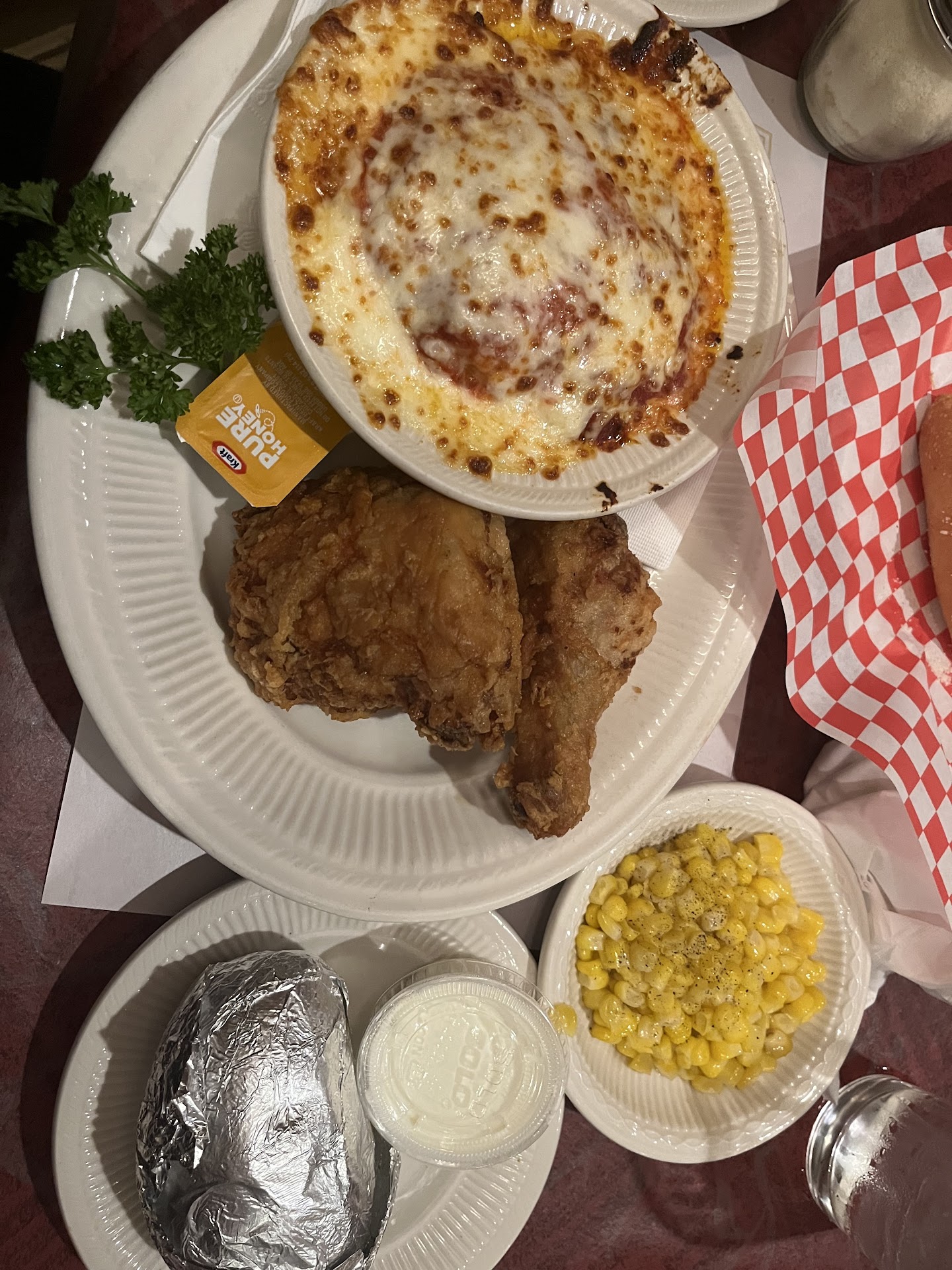 The Salad was good, although it had to much lettuce compared to the amount of other toppings (such as olives & onions etc) that were placed on top of the lettuce, not mixed within it. The Chicken Cacciatore didn't have many peppers & onions with it. The chicken that was served 1st was over cooked, dry, didn't have much taste & mainly was wings & legs without the thighs. When we requested more the gave us mainly legs & thighs with a few breast sections.