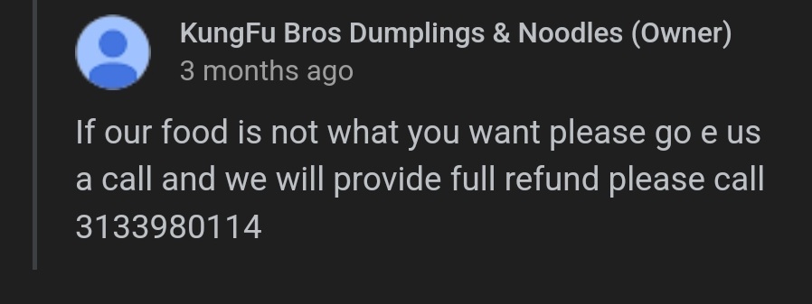 UPDATE: Sir, I didn't ask for a refund because "I didn't like it", I asked for a refund because it wasn't what I ordered. The police comment wasn't a threat. I DEFINITELY would have called. But I took my loss and will not return. You know I'm telling the truth! Follow your own policy, as shown in the picture below. I called first, then took the "soup" back. You didn't honor your own policy.