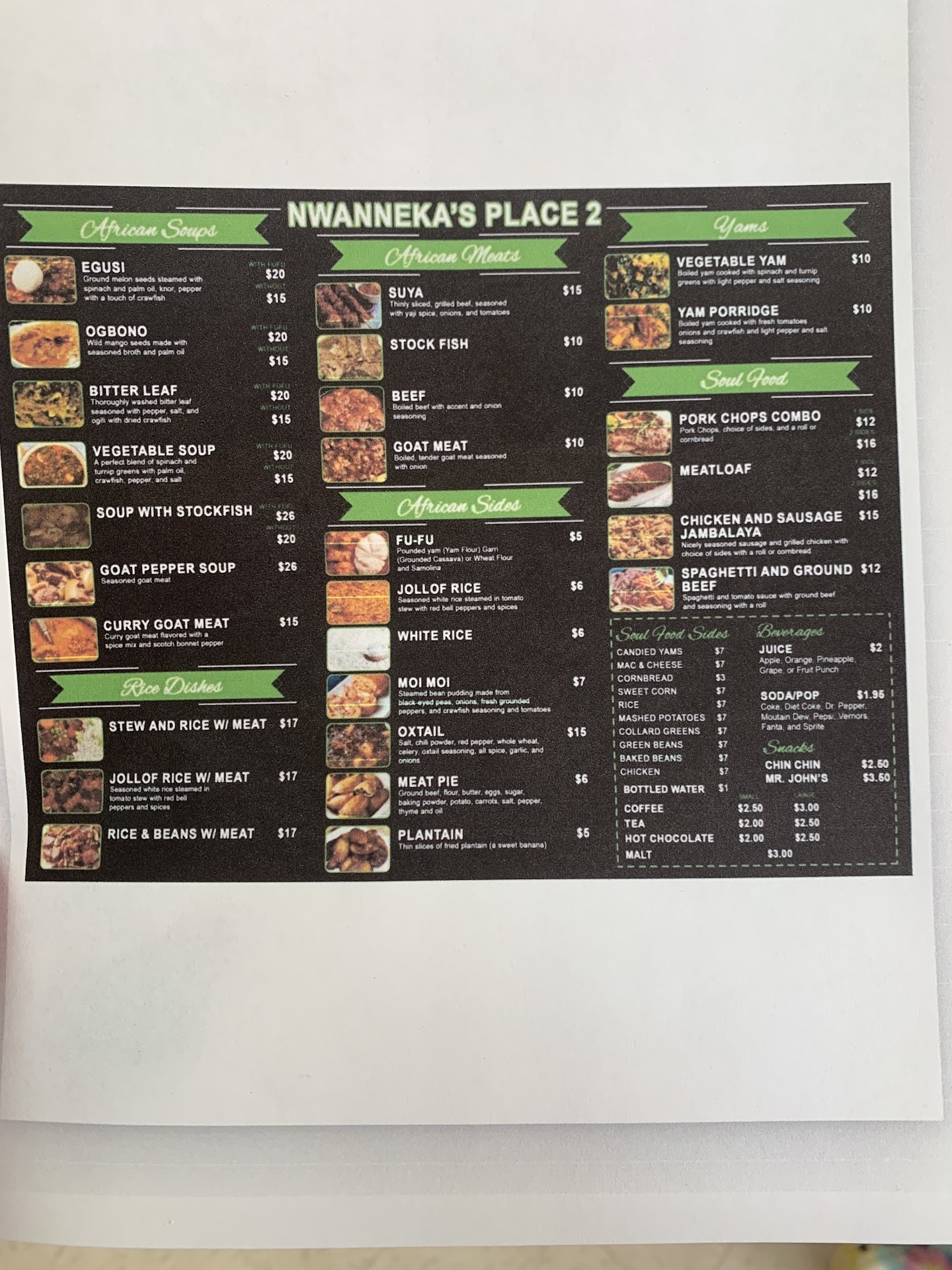 Ā Ā Ā Read moreI fell in love with Egusi and fufu but my usual place was a bit out of the way. Ordered online and all went well. The person behind the counter asked for my phone so he could take a picture of my order confirmation (??? Didnāt like that at all). I got my food home and was excited to see the portion size. My original place is a bit smaller for the same price . But upon opening the container I was hit by the smell. I can only describe it as dry dog food (wet kibble). My kids all said yuck and mom that stinks. I donāt believe that I have had goat before and wondered if maybe this was the reason. I ate some anyway. The meat was good and all but the smell was so off putting. I couldnāt finish even the little I had served up. My stomach started to hurt and making gurgling noise. The color was not nice and it was very very thin in comparison to what I had come to know as Egusi. I am sad to say that it went in the trash for fear of it being bad. I most definitely will not be going back to try...