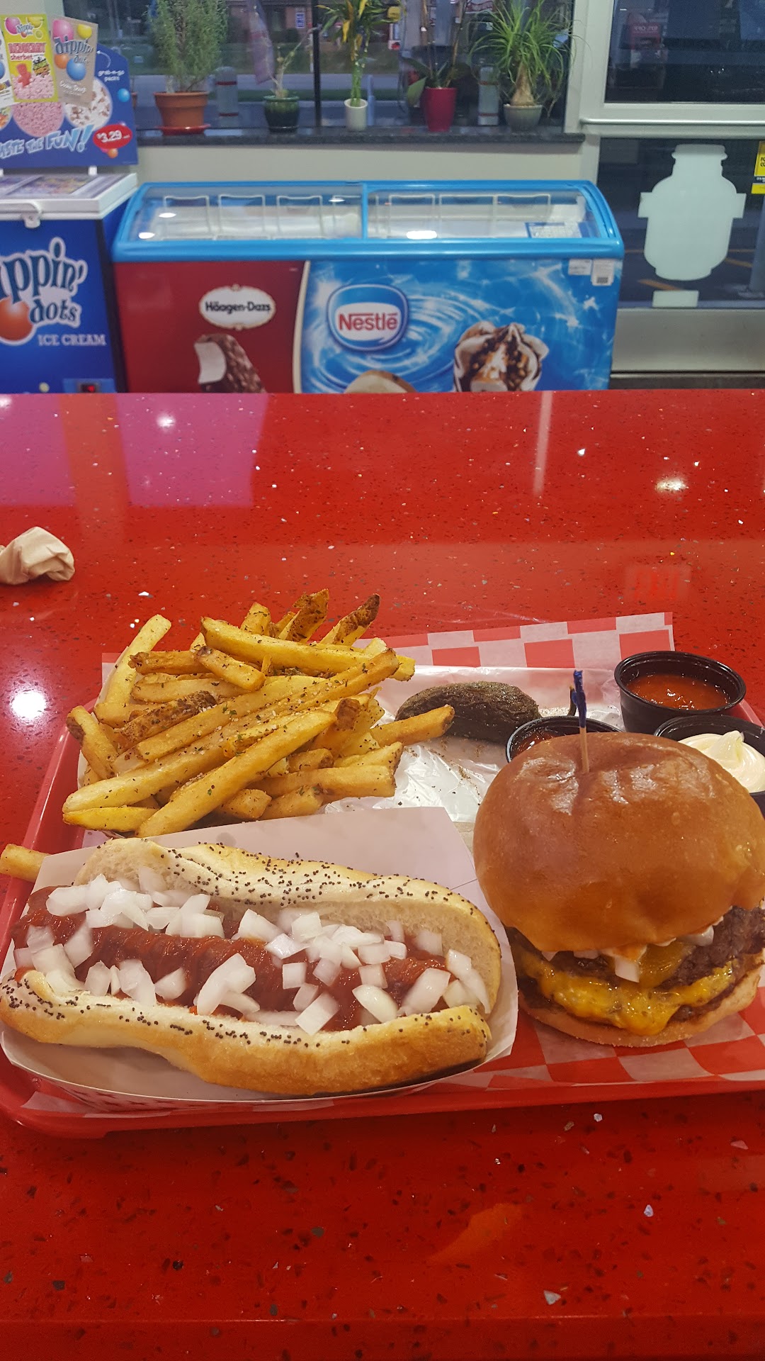 Read moreI was a little reluctant to try this place at first since it's located inside a gas station, but I was pleasantly surprised. The burgers are pretty good and everything is cooked to order. It's a little pricey but filling, especially if you order fries with it. I stopped by recently and noticed they had added some new items to the menu, including fish sandwiches (which was a little bit too greasy for my taste). They also sell specialty hot dogs which I haven't tried yet.