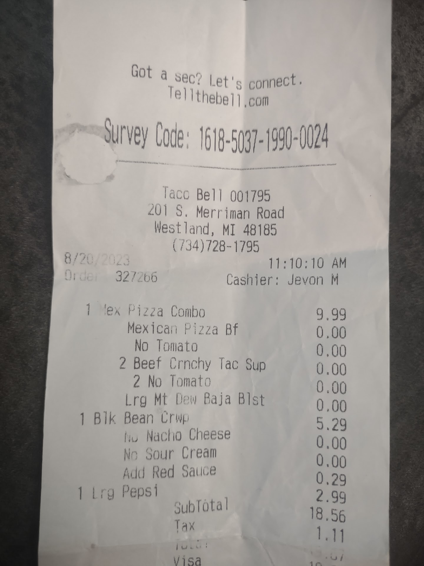 Ā Ā Ā Read moreMe and two friends went to Taco Bell tonight 7/11/25, when we got there, they had no one in line. We pull up to the speaker & try to order two tacodillaās (pictured on the menu) the lady said āwe donāt sell that at this timeā. We said ok just give us a minute. We then proceeded to order our food. We paused after ordering two items, to then have one woman say āis that all for you?ā We said āno just one minute pleaseā. Then another voice says āis everything correct on your screen?ā My friend says āno just one second please!ā. This women seemed aggravated with us. We finish the order. We get to the window, no customer service at all, the lady at the window acted like either her life was miserable working there or we just ruined her night by asking for a little extra time. We ignored it all and continued to be kind. We get our food, we had everything in the bag. We get home & this is how my quesadilla looked! SOAKED IN JALAPEĆO SAUCE! I called and spoke with the manager, her response was āoh you got the order behind you, they ordered extra sauce!ā !!!! THERE WAS NO ONE BEHIND US WHEN WE PULLED OFF!!!!! This wasnāt taken seriously at all! If you hate your job & customer service you shouldāve made other choices in life, there was no need to take it out on people who did nothing but used our manors the entire time! I paid for my food & couldnāt even eat it! I WILL NEVER...