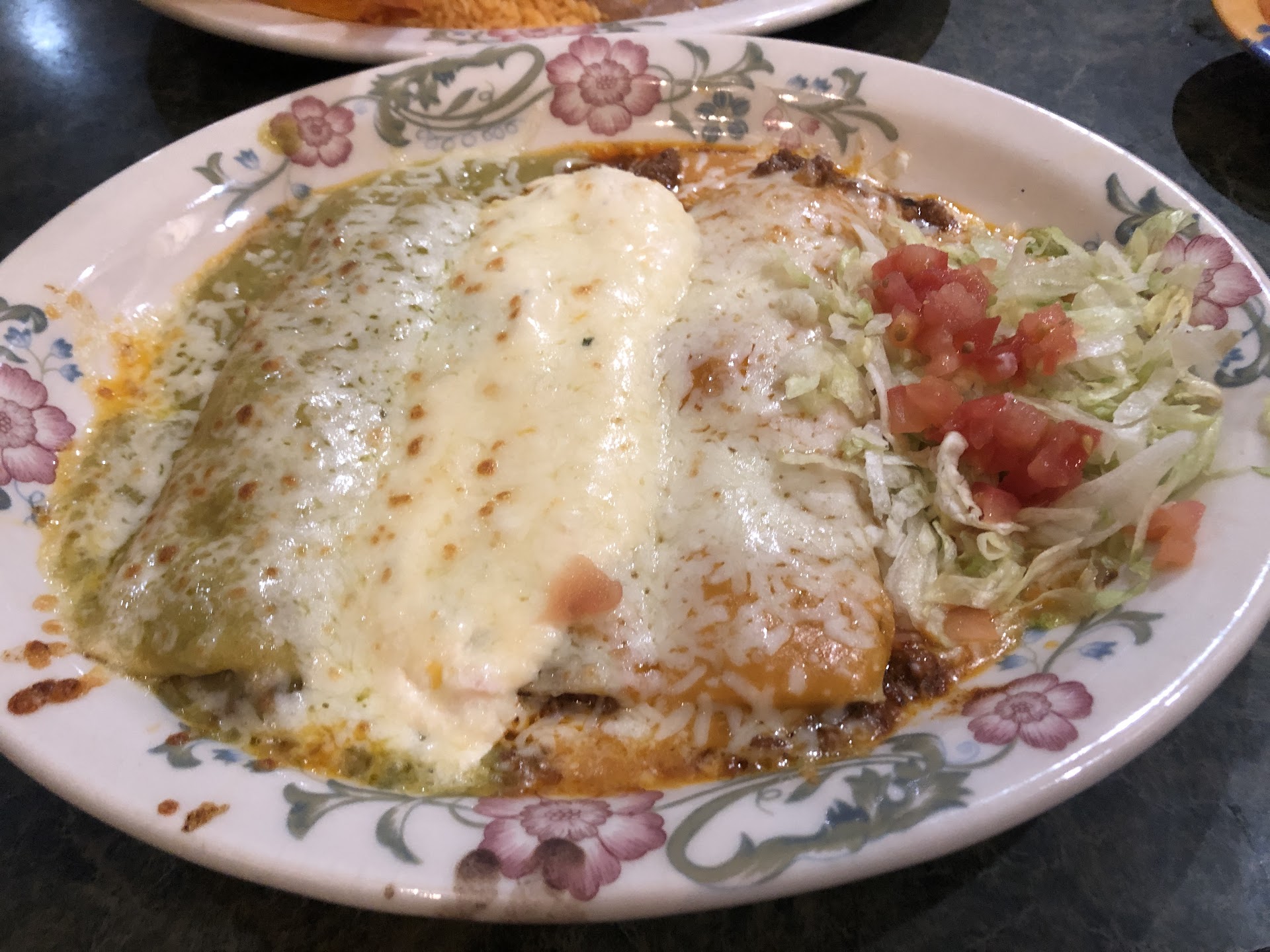 Our meal was served piping hot with tons of cheese on top. There was a tiny bit of green chili hidden underneath all of the cheese.