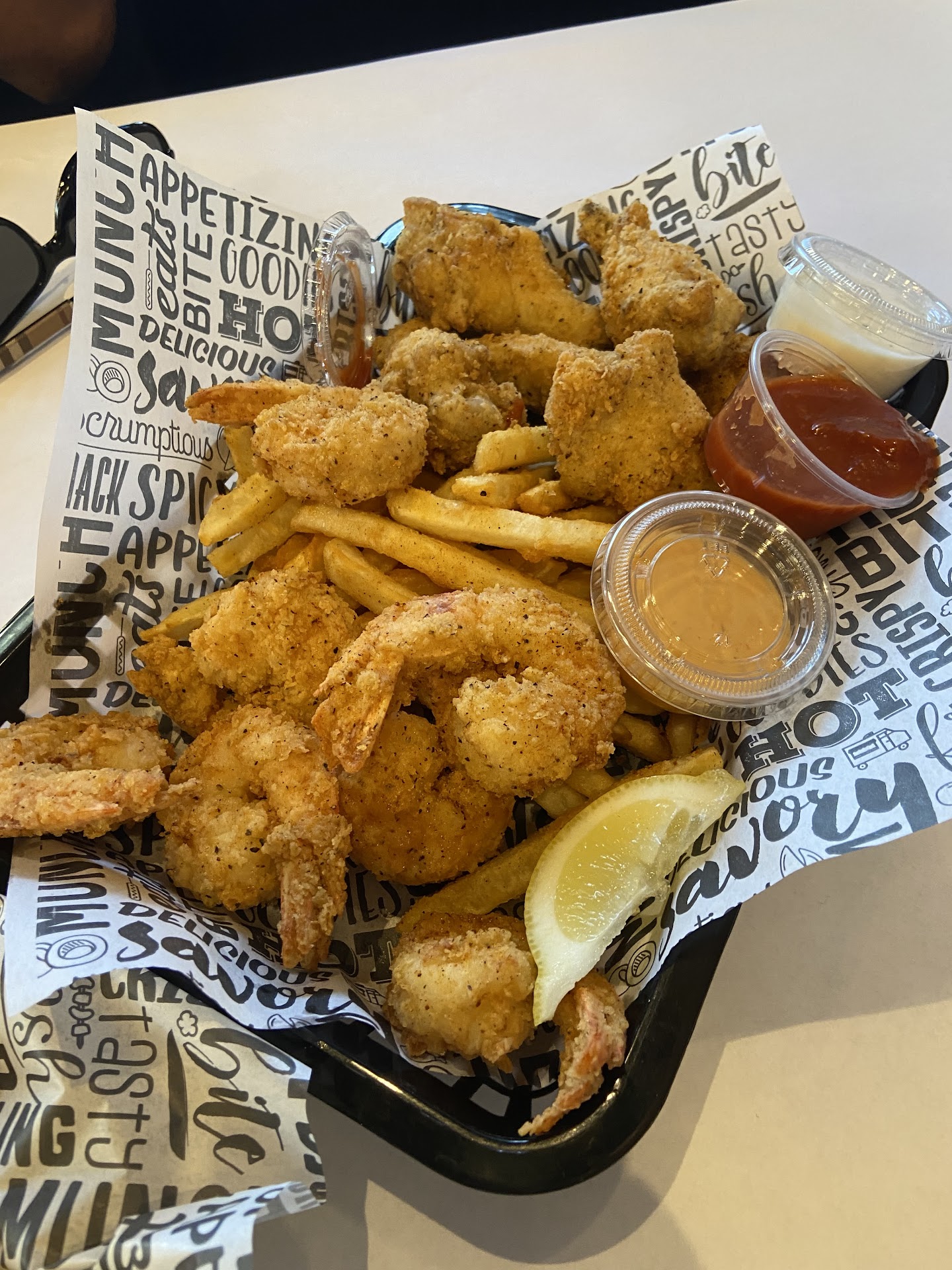 Appetizer Platter (Fries, Wings, and XL Shrimp) Presentation was great. The batter was good on all. A tad more seasoning would have taken it to the next level of delish. - See Pic
