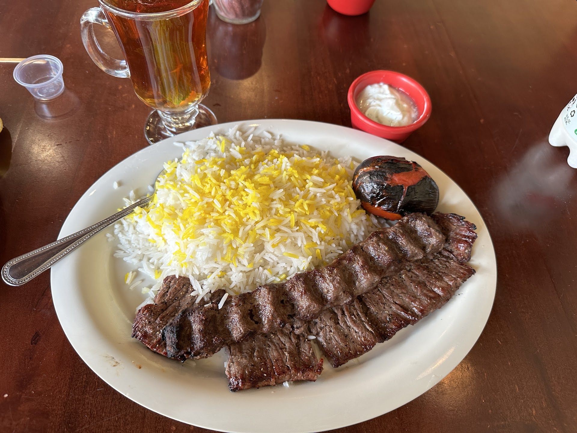 Read moreWAAAYYYYYY OVERPRICED. Spent nearly $80 on lunch. This is lunch at a cafe style, counter service restaurant with paper cups, not dinner for adults at The Oceanaire, just lunch for two adults and two toddlers. A tiny little skewer (maybe a third pound if that) of salmon with maybe 1 full cup of rice is $13.95, and then if you order an extra skewer of salmon it's an additional $12.95, so two skewers of salmon on a plate with a cup of rice, which would be a normal meal at any other restaurant for around $14-$15, is $27 at this place. Are you kidding me? A chicken skewer with a cup of rice on a plate with nothing else is $10. No way. A side of grilled veggies on a 3.5 inch plate (maybe a quarter pound of veggies if that) is $3.95. Seriously? A get it yourself fountain drink in a paper cup was close to $2.50. Wow. It seems to me as though this place maybe slowly failing and the owner is jacking prices through the roof to maybe somehow try to break even before he goes under or something crazy. As for the quality of food: for the price I paid I expected dancing girls and a gold medal ceremony when the meal was done. Instead what we got was average Middle Eastern food. The salmon skewers were a tiny bit overcooked making them slightly dry but not horrible. I would say the food quality on a 1 to 10 scale is about a six or seven. Definitely not worth $80 for lunch. The tomatoes on the grill vegetable plate were mushy and fell apart when you try to cut them. The green peppers were crispy and fresh and the onions were grilled very well. This was the highlight of the meal. The service here also seems to be in disarray as the food delivery/table cleaner person, not once but twice, tried to bring wrong food items to our table that had been ordered apparently by someone else. In hindsight, we should've just taken them and maybe felt a little bit better about having to take out a second mortgage on our house to buy lunch at a fast food restaurant.