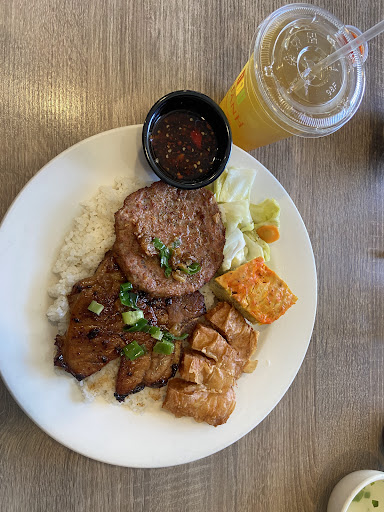 I usually order the Cơm Tấm Sườn, Chả, Nem, Tàu Hủ Kỳ, and the combination is well-executed. The grilled pork chop (sườn) is flavorful with a light char and tender texture. The egg meatloaf (chả) is moist and seasoned just right. The shrimp paste wrapped in bean curd (tàu hủ kỳ) adds a crispy contrast, and the nem (cured pork roll) has good balance without being overly tangy.