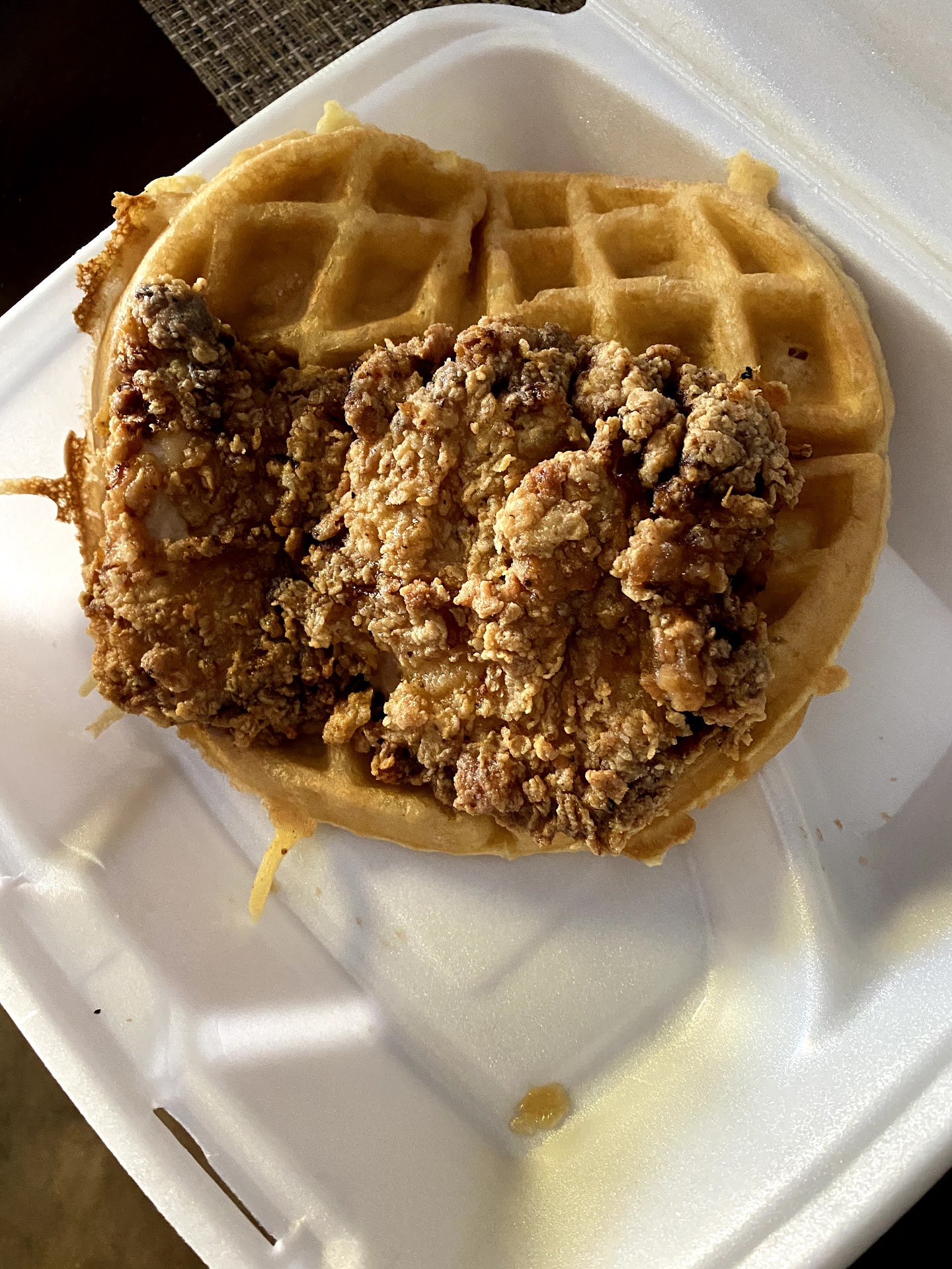 Our food was cold, like it had been sitting there for a long time. The waffle from my chicken and waffles was soggy, which I assume was from the chicken, because it was oozing with oil.