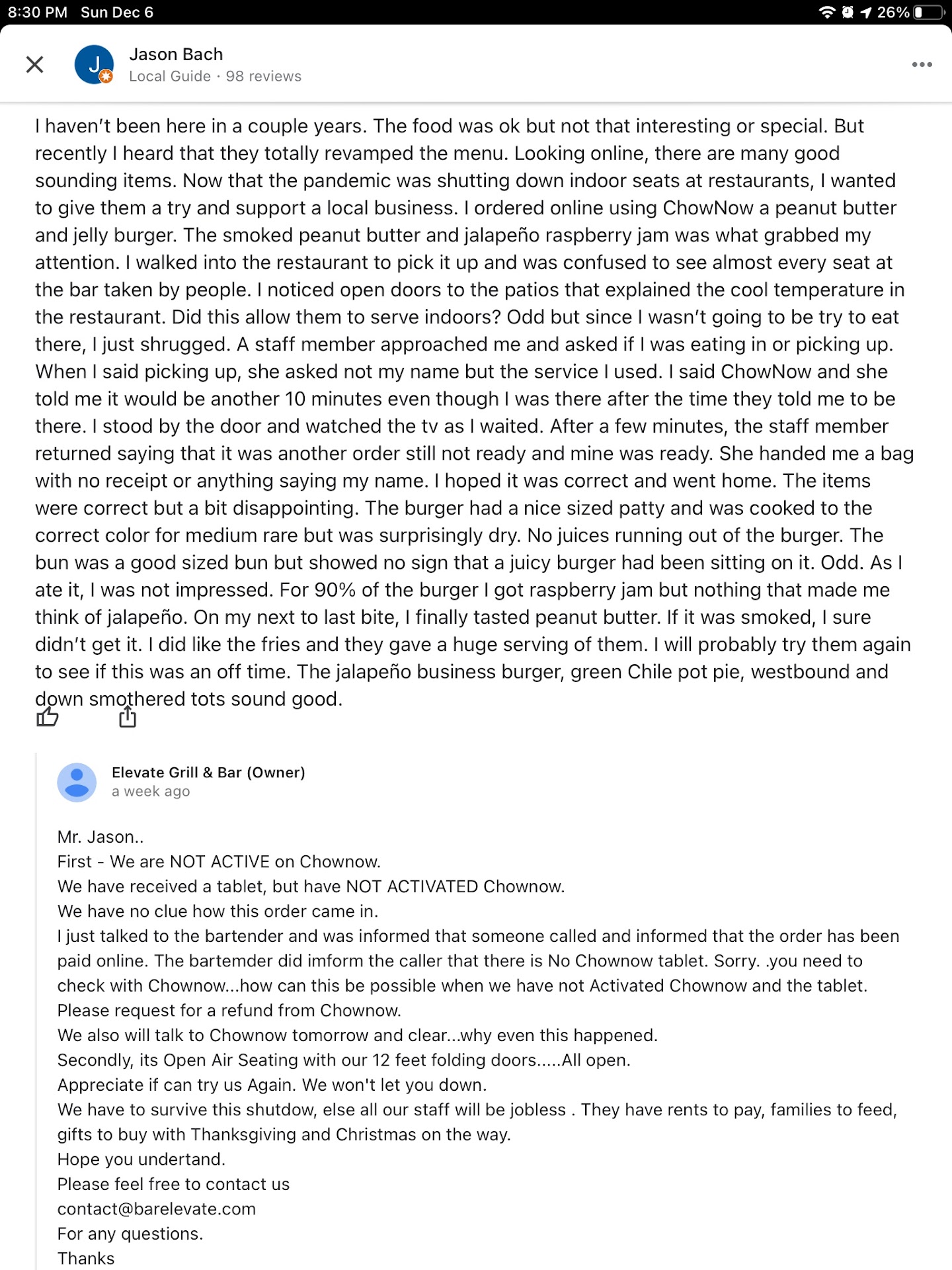 This is a review for Elevate Grill and Bar in Westminster.