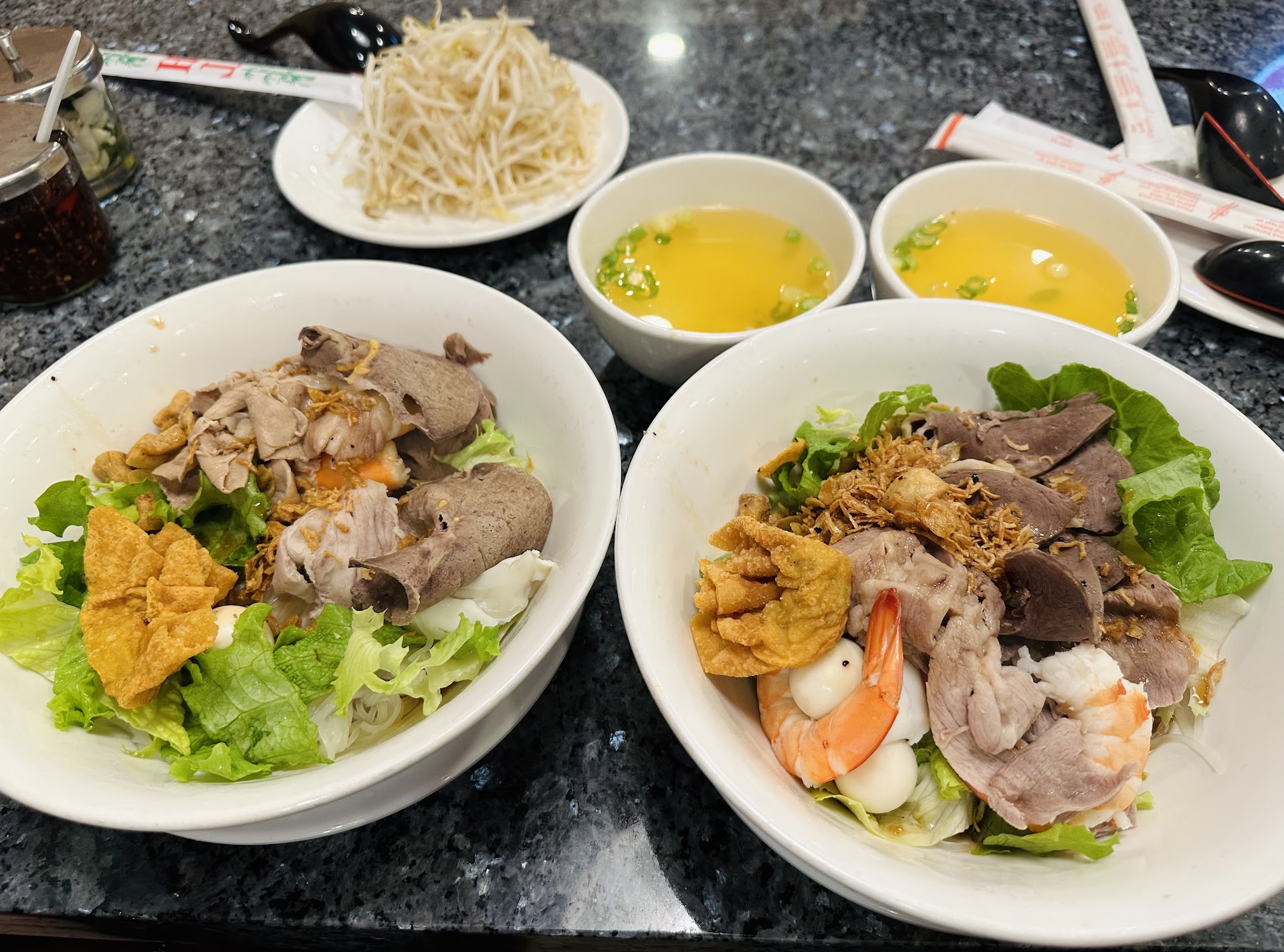 The menu is simple - two pages - food on the front, drinks/dessert on the back. I was trying to decide between the Com Ga Hai Nam, or the Bun Bo Hue - went with the BBH when I found out the steamed chicken is served cold.