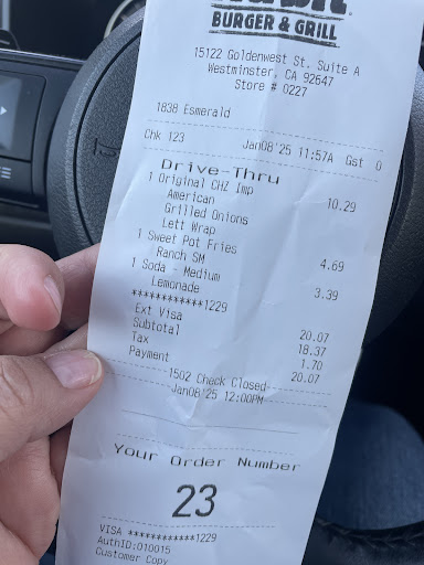 Read moreTerrible!! we were charged for somebody else's order, $40.00 for 2 burger combos(no cheese or onions) which we did not receive. We ordered water bottles, and one milk shake.Did not get these either. WE got 4 burgers with onions and cheese, 4 fries (soggy) one orger of chicken nuggets,! threw these in the trash. no drinks no water or milk shake. and door dash left it next door at the wrong house. we could barely eat the fries they were so soggy. WE tried to eat the burgers, but they were too filled with cheese and onions. threw these away also When we called to tell the manager. \she said they would reimburse us, but she never did, so we're out 40 dollars with the $9.00 tip