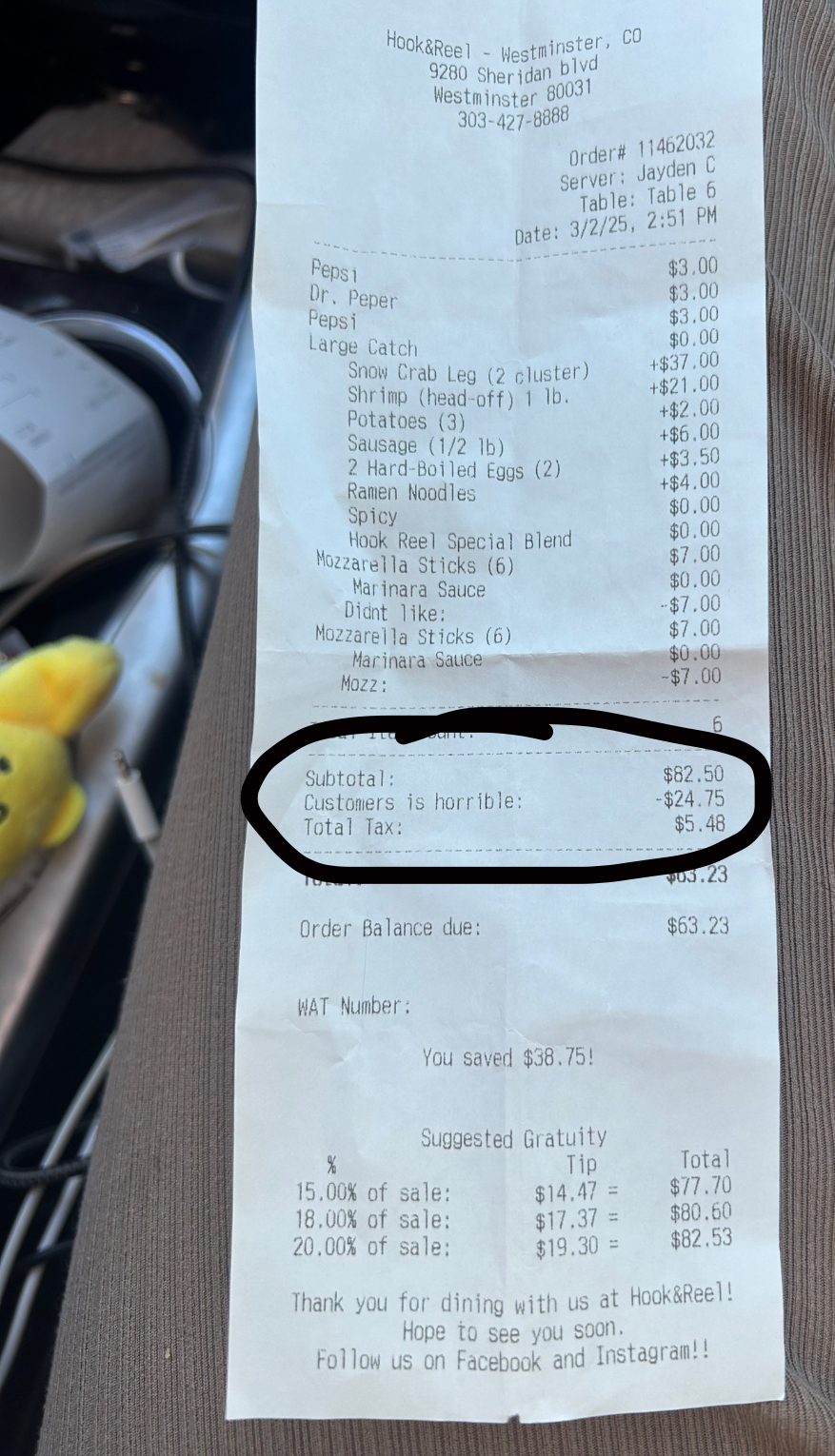 The manager said she could take off the food and give us a discount and everything was alright. However, we got the receipt and here is what it said on it (picture is attached). She took off the price of the mozzarella stick and wrote that it was take off for the reason of âdidnât likeâ, and the 30% she took off was because âcustomers were horribleâ. When we complained to her about it she said that it is the stores protocol to write that. So Hook and Reel, is that really how your restaurant is supposed to treat your customers? According to the manager at the 9280 Sheridan Boulevard restaurant thatâs exactly what the resturant was supposed to do.