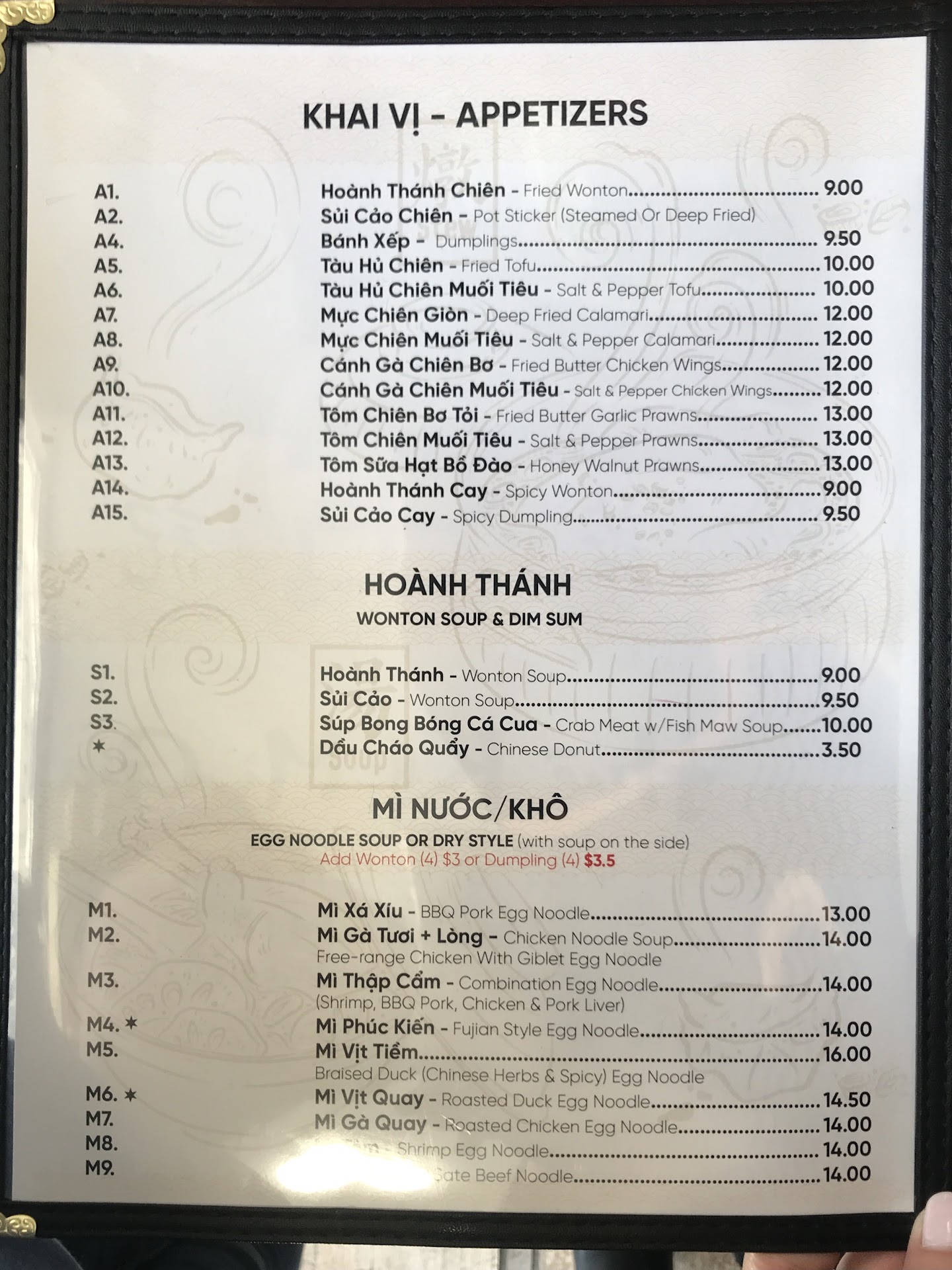 They have a decent menu with a wide range of mì, bánh bao, and hủ tiếu options. Food was decent, but not good enough to make up for everything else.