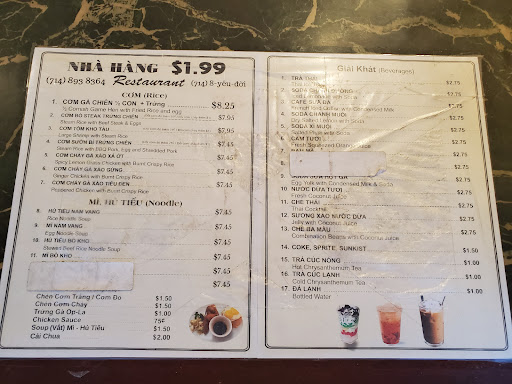 Nha Hang $1.99 is a hidden gem for authentic and budget-friendly Vietnamese cuisine! The food is delicious, with generous portions at unbeatable prices. Their mĂŹ Nam Vang is flavorful, the fried Cornish hen plate is a must-try, and their chĂš ba mĂ u is the bestâexcept it doesnât just have three colors, but seven! This is the only place that offers it. Plus, their sÆ°ÆĄng sĂĄo nưá»c dừa is incredibly tasty! Every time I visit California, I have to stop by and buy 5â6 cups to bring back to Las Vegas and enjoy later. The owner is kind and friendly, making the experience even better.