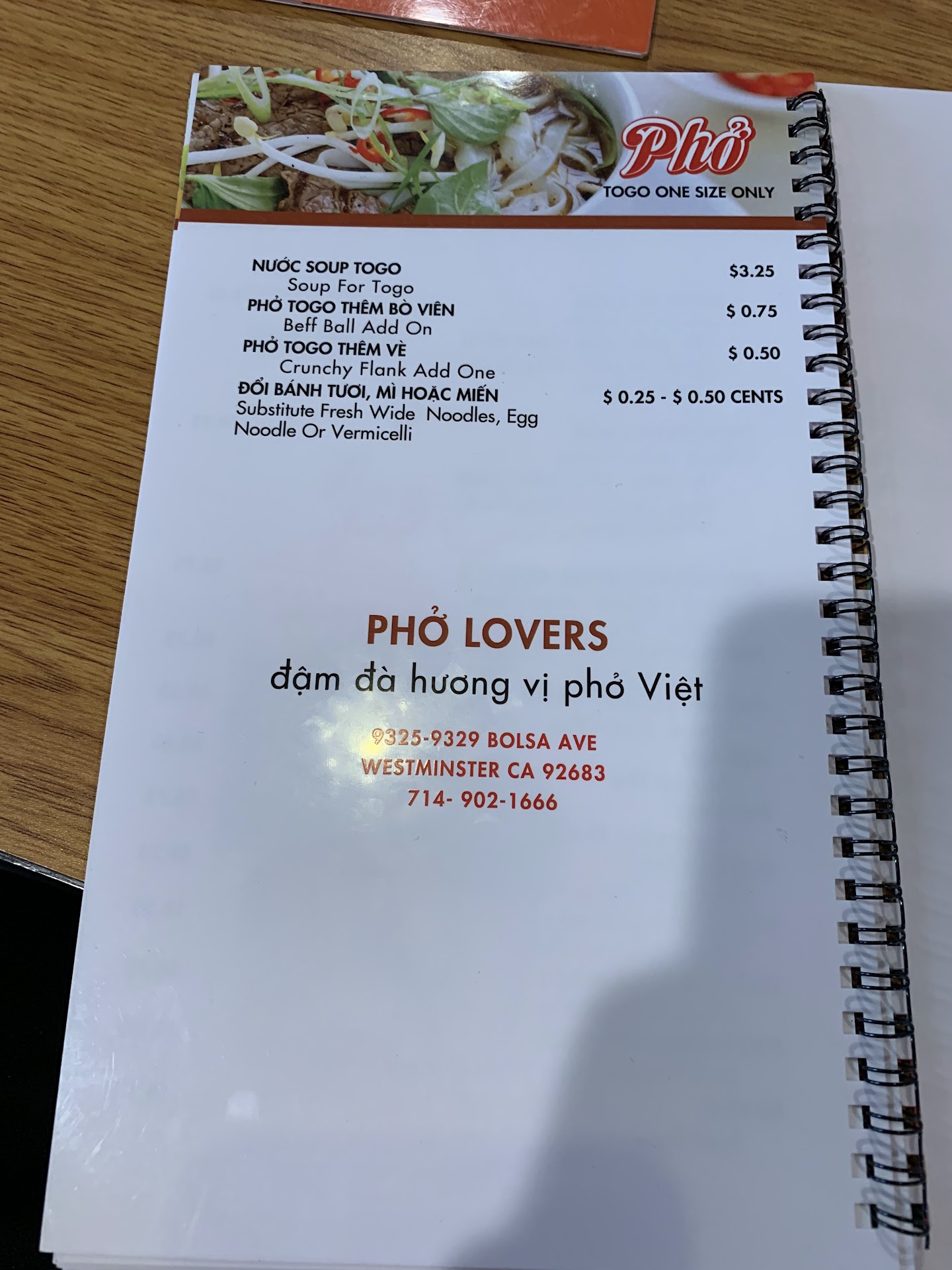 Read moreThis pho eatery is in the middle of Little Saigon so weekends during peak hours like mornings and lunch will be challenging to navigate and find parking. Weekday mornings is the best time to go with no crowds and no traffic. I ordered the pho tai (rare beef) and the broth was good but they serve clumpy noodles which is a very big pet peeve of mind. Listen pho restaurateurs, clumpy noodles should be banned. Breaking up clumpy noodles with chopsticks in BOTH hands in my piping hot bowl of pho makes me extremely agitated. I will always knock a star off for clumpy noodles. Noodles should always be swimming freely in the soup. Its possible that they have fresh noodles so ask when ordering. What I do like is that their plate of garnishments: Thai basil, culantro (saw-leaf), flash boiled sprouts, jalapenos, lime, and rice paddy herb! Very few pho shops provide rice paddy herb (citrusy-cumin like flavor) so toss this guy in your bowl to...