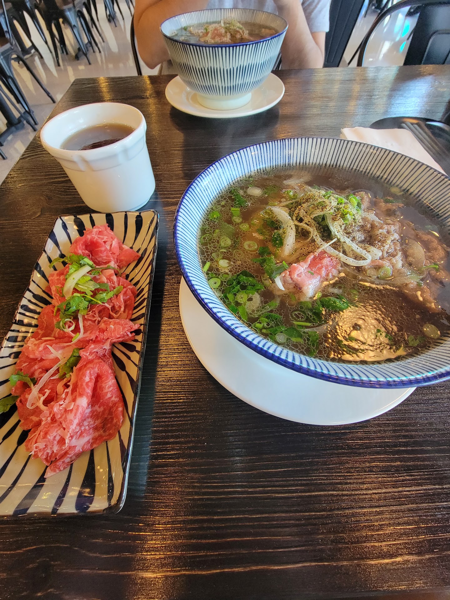 Service was good. I asked and was given water to drink while waiting for my order. I saw a container of whey protein behind the register and jokingly asked "How much do you charge for a scoop of whey protein powder in my pho?" Ample seating via handsome bamboo furniture. Flatscreen TV's available for diner's viewing pleasure.