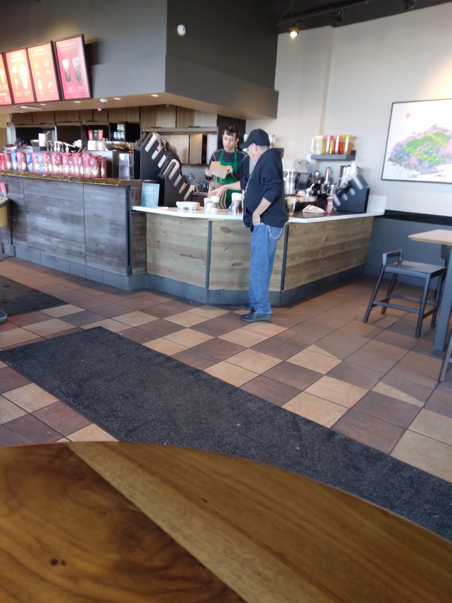 Read moreEvery visit I have had at this store leads to an outrageously long wait time. We have waited for nearly 20 minutes for our drinks, there are two baristas here, two other people, my mom, and me in the store. This wait time is completely unacceptable. As a former Starbucks barista, I was pretty shocked by what happened at my most recent visit to this store. When the drinks on the bar were mixed up, a lady drank out of what was suppose to be my moms drink. When she walked up to straighten out this mix up, the barista took the drink that the other lady had taken a swig out of, and simply swapped the lid for a new one, and placed it back on the bar. My mom has to request her drink be remade as she watched the other lady drink out of it. The barista claimed to be unaware, and remade it. This is far below the standard I was trained at as a barista and frankly quite concerned that this sort of thing could have happened here before. A handful of baristas at this location are great, the rest, should definitely get a refresher...