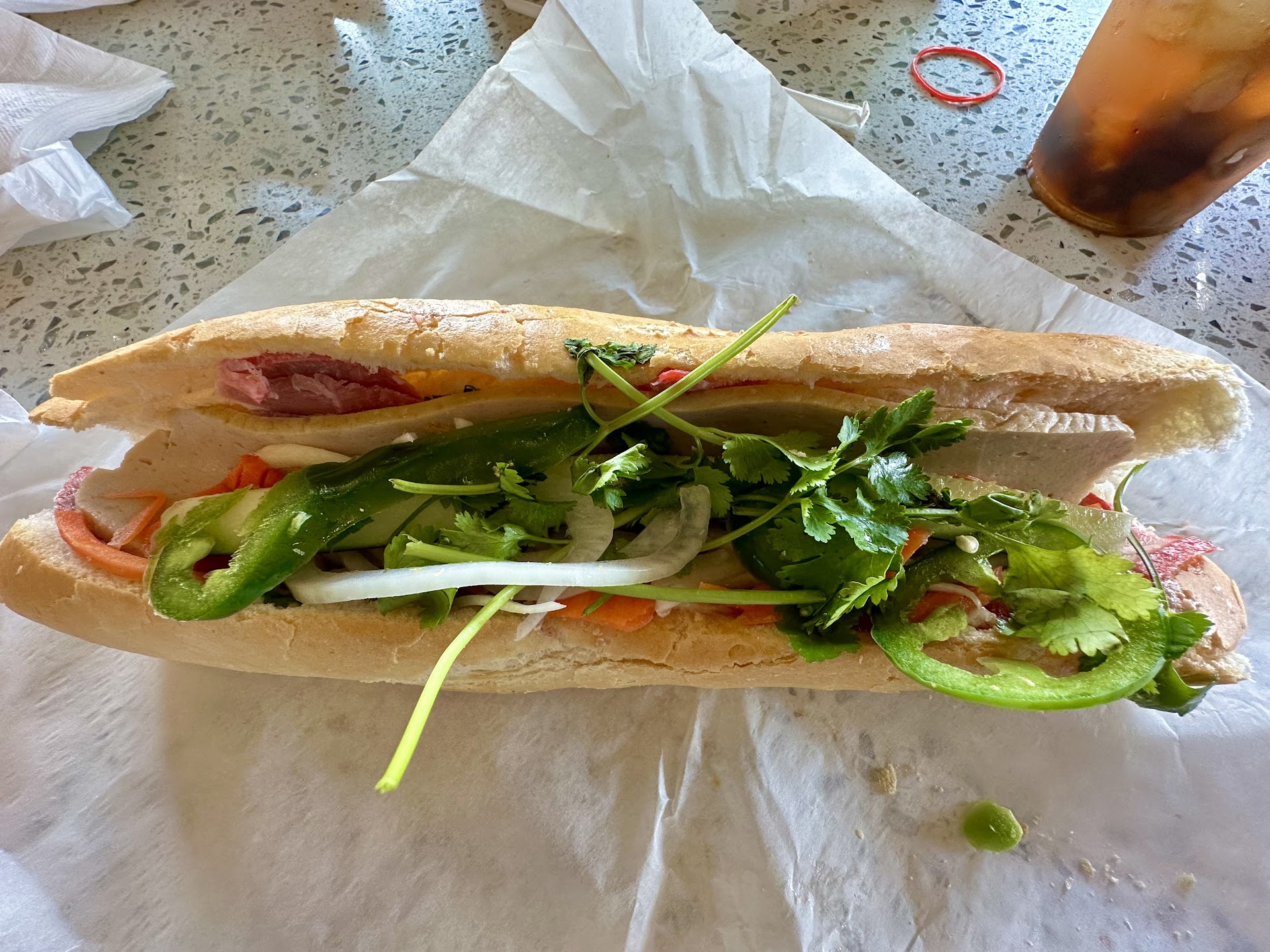 Read moreNot a bad spot for Banh Mi. Nothing mind blowing but pretty good. This is the basic order at the counter and pick up at the counter when your order is ready. They have to go items ready for grab and go as well. The Banh Mi taste good but is a little skimpy on the meat. And they’re made fast so they can be a little messy. They have a bunch of specialty Vietnamese drinks available as well. The Vietnamese coffee is very good. There is ample inside and outside tables. Note, they have a very high credit card...