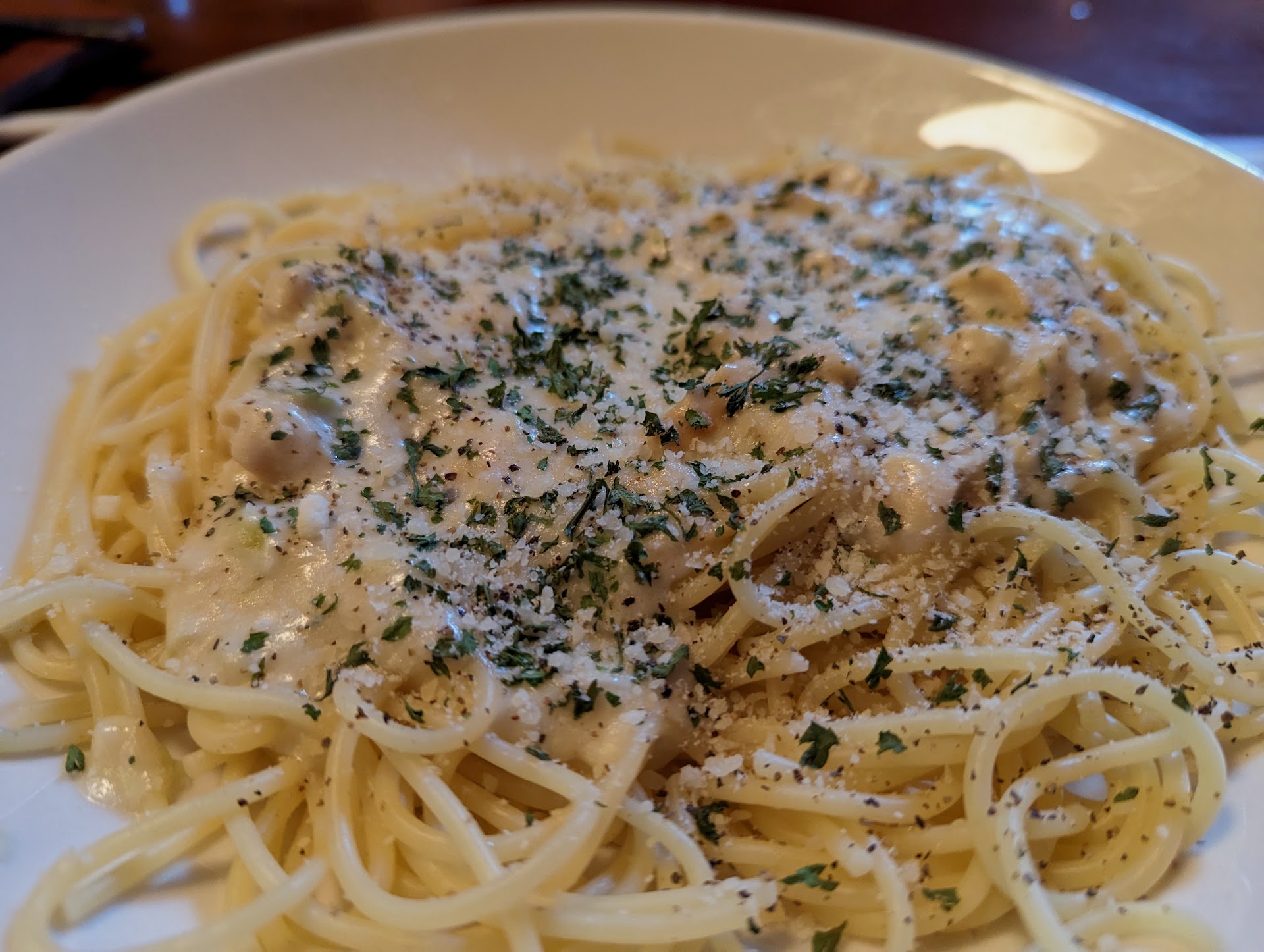 For my meal, I was compelled by nostalgia to have the same meal I always had in my teens. I had the garden salad with creamy pesto dressing (OMG, yum) and spaghetti with white clam sauce. I always ask for a little marinara on the side and I drizzle a couple tablespoons over the top. I assume that cuts the richness for me. What it really does is make it super yummy!