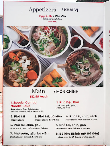 When it comes to phở in the OC, the competition is tough to beat. My family knows that good phở is difficult to come by so our expectations were not very high. The menu is very straightforward with wide options of meat choices for the beef pho. Although they don't have many different appetizers or other dishes to try out, we didn't mind since the phở seemed promising.