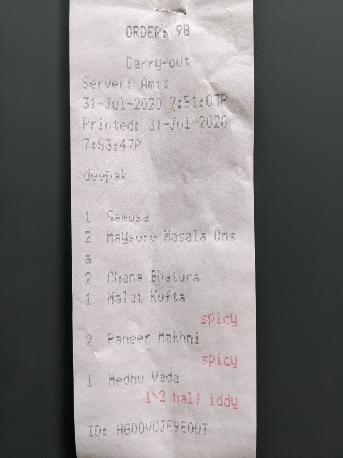 The onion rava masala dosa looked good when it arrived with holes that I mentioned in my review of A2B's same item but soon turned into a nightmare. The chef must have forgotten about the dosa as it was desiccated/dehydrated beyond imagination to the extent the masala has become dry and the onion had caramelized. I was joking with my family that the dosa was hard and crisp enough to chop up vegetables. I could not even eat half of it. The sambar is good and a decent quantity but of the chutneys, only the tomato chutney is very good, the coconut one is ok but the third one of fried lentils is insipid, though the quantity is once again like the "tabbaruk" or prasad you get in your places of worship. At $12 it's certainly not worth it. A couple of ready-made Gits rava dosa mixes for half the price, from the next door Indian store would have been a better experience for my taste buds.