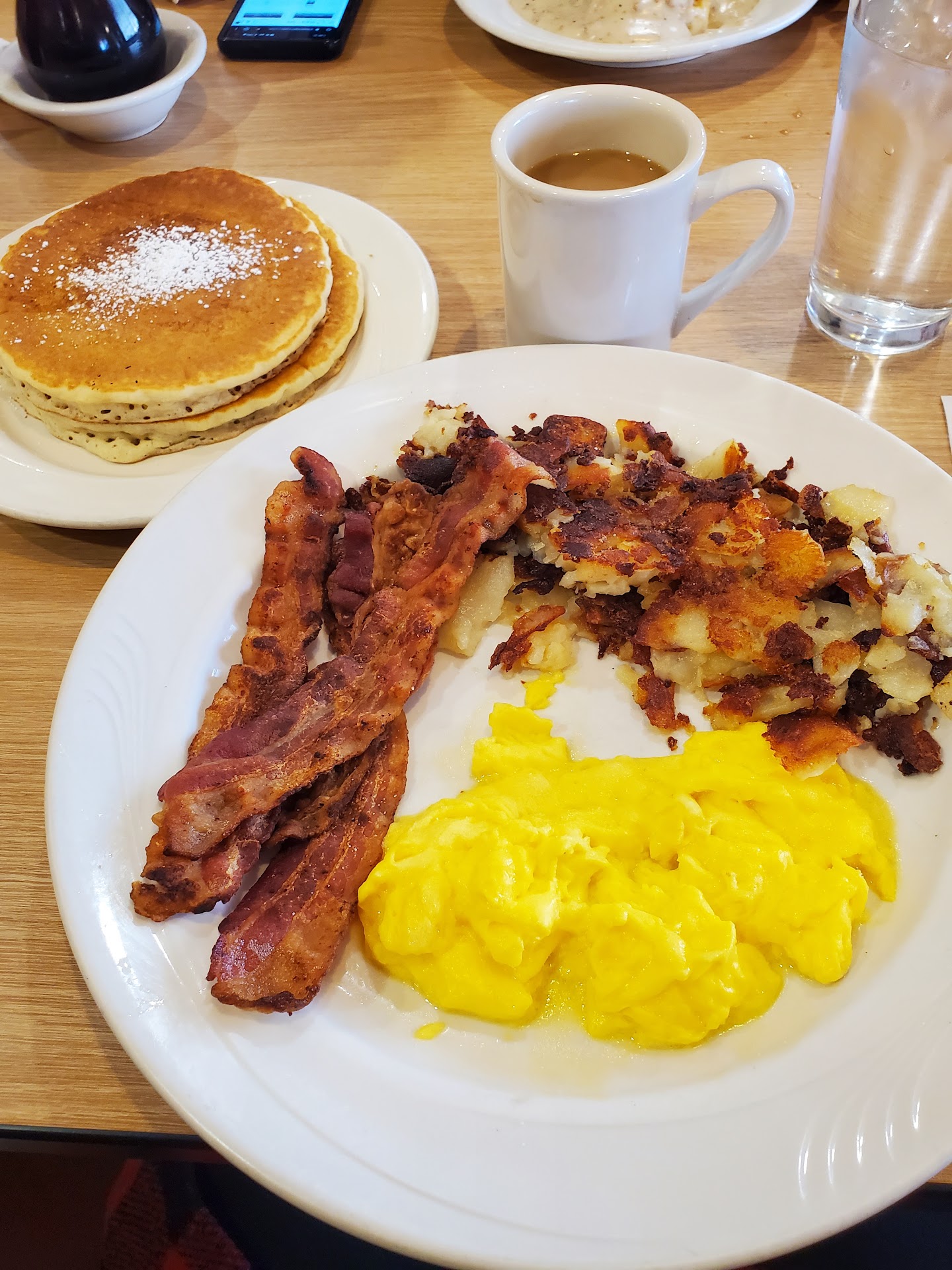 The food was excellent, arriving quickly and piping hot on classic white plates. Pancakes, bacon, fried eggs, Greek toast, omelets, and hash browns—everything looked and tasted exactly as you’d hope. Comfort food, done right.
