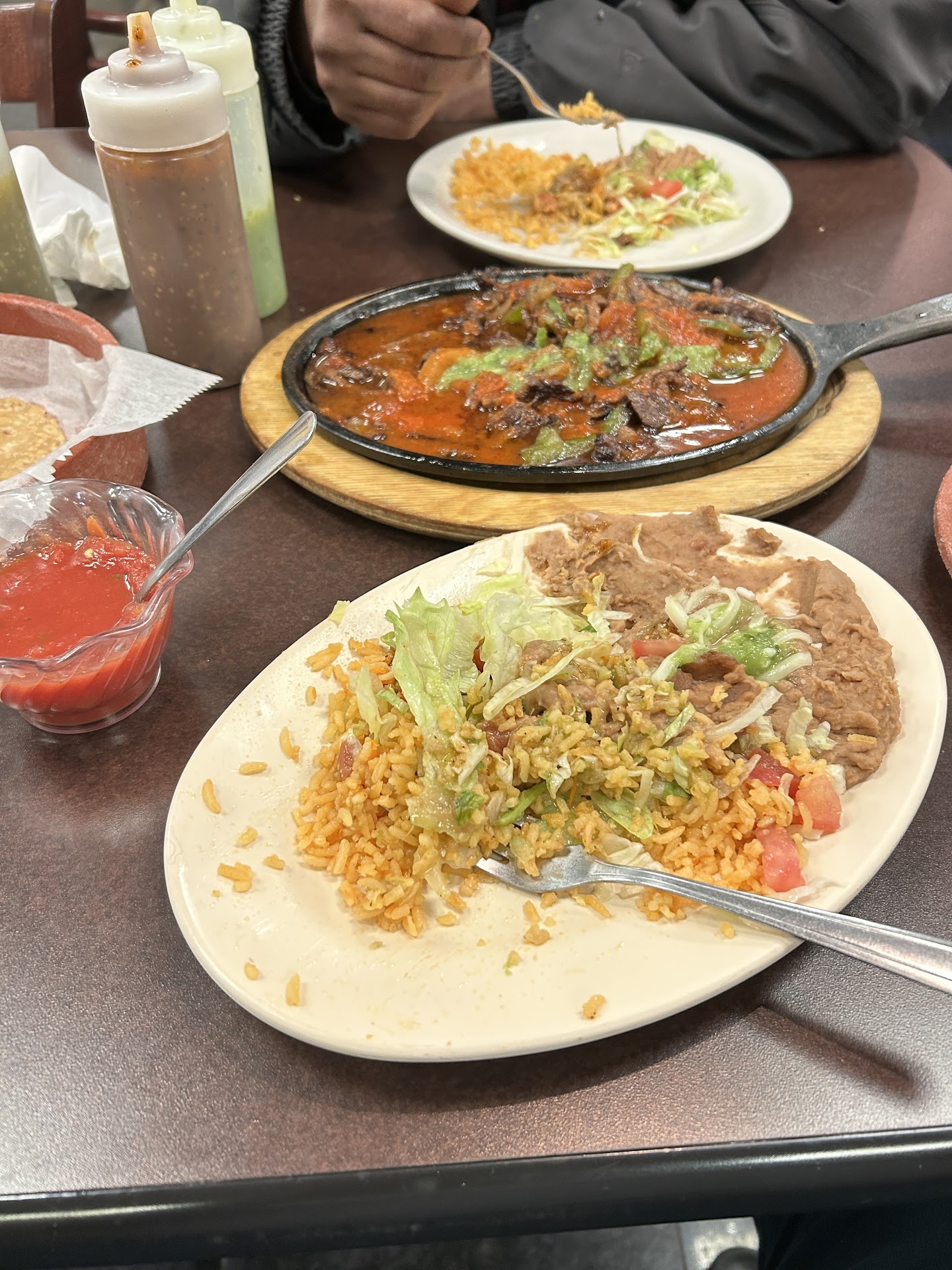 I eventually settled on what I wanted and had a seat. The same server brought me a basket of tortillas and red salsa, but didn't take my order. She got busy with a group of older folks at the next table, who arrived later than I did, but actually got their food before I did. (These older folks later left with another woman who works there. Maybe related to the owners of the restaurant, or are the owners themselves?)
