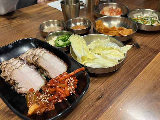 We ordered a kid’s SulLungTang, a (S) premium bossam, beef bulgogi with glass noodles, and the Braised Spicy Premium Beef Rib with Flat Glass Noodle. Everything was delicious! I wish we were told that the Small bossam would be “appetizer style” because we found out after that the medium and large come on the skillet with the tofu. But it was delicious! All the accompaniments were so good, everything paired so well together. Would absolutely eat this again. The bulgogi glass noodles was good but a smidge too sweet. I didn’t understand why this came on a burner because every was cooked and the heat just made it more soggy. The server said to turn off the fire once it boils but it was all cooked already so I didn’t get it. The spicy braised beef ribs was soooooo good. Definitely spicy even when we got the “less spicy” level. The chewy rice cakes and noodles cooked on the burner and it just made everything combine so well and tasty! Love the squash and veggies in it and the flat glass noodles were great. Chewy and delicious. Oh! And they have purple rice!!!