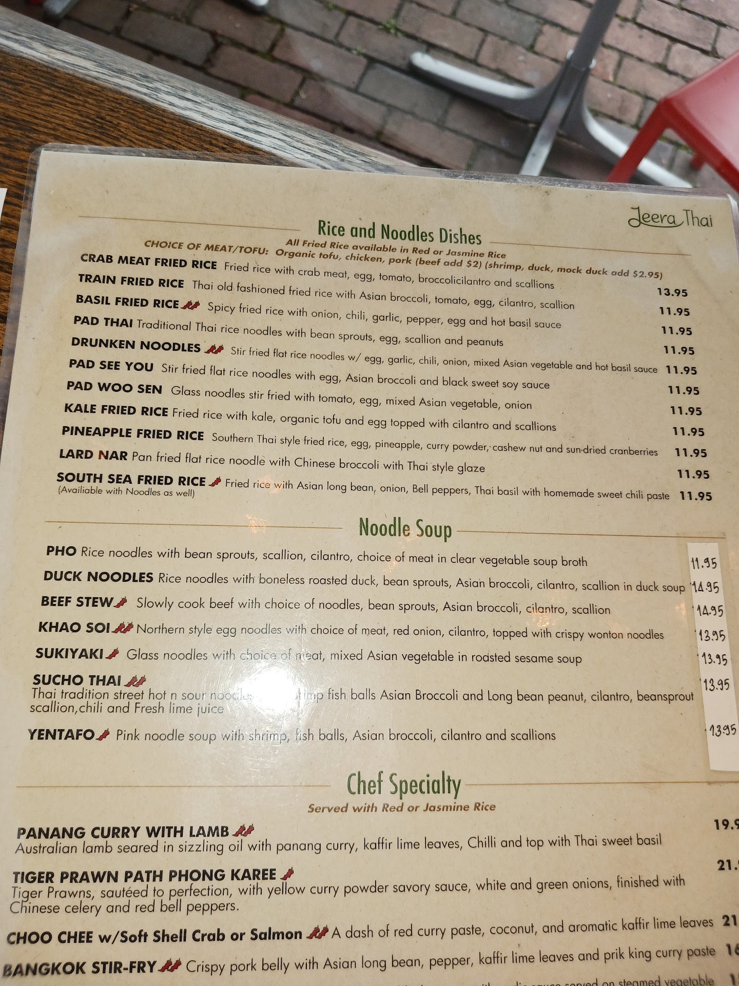 Read moreFraud on billing experience by staff overshadowed tasty food. Beware of small frauds at this restaurant. Menu price was $7 less than we were billed. It seemed strange when I asked for a glass of water & the older woman gave me a higher-end Fiji water bottle, then a lower-priced bottle of water before the other staff member gave me the tap water in a glass I asked for each time. This supports what happened with the bill at the end of our lunch as I'm an internal auditor/Fraud Accountant by trade. The mango curry menu item was priced at $13.95 & pad se ewe at $11.95, but we were billed $16.95 & $14.95 respectively. When we noticed & asked about the difference, first they said we ordered off the dinner menu, not the lunch menu. There was only 1 menu, so that isn't possible. Then they said the menu price is different for dine-in at the outside table that we did, and the carry out price is the lower price listed on the menu we used. Then we saw an extra charge for tofu instead of chicken, but that's included per the menu text & photos as shown. Finally, they said there was an updated menu recently and we ordered/used the old one that was outside at the table we sat down at to order. Also not possible, since the only version of the menu was the one the had on out table & we used to order from. We still tipped 17%, but will contest this with the credit card company since the staff was unwilling to bill us correctly. Watch your bill if you...