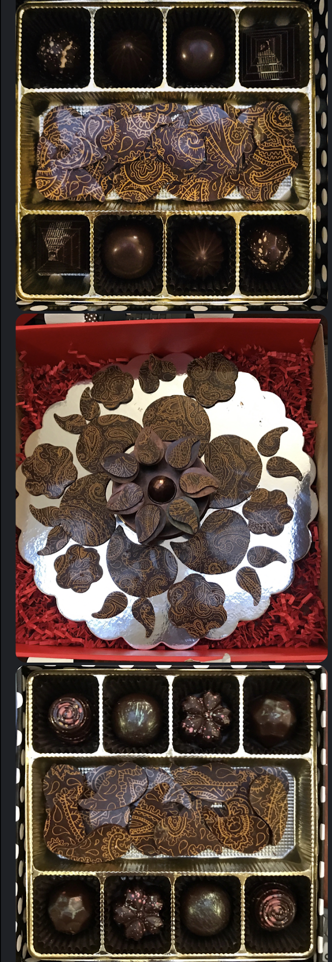 I was looking for a special cake for some close friends who were celebrating their 80th birthdays and I came upon Le Rouge Handmade Chocolates & Cakes by Aarti in Westport, CT. Under a long list of products, I found "Limited Edition Showpieces" and I was stunned by the artistry of the selections. They were literally works of art in chocolate. I called Aarti and she helped me to select two pieces, a Limited Edition Chocolate Diya and a 2015 Limited Edition Chocolate Rangoli. My friends are from India, so I thought that these designs, which one sees at the Diwali Festival in India, would be a special gift that would remind them of their homeland. Aarti suggested the addition of some special truffles, which included some exotic flavors such as chili masala and cayenne. Also included were silver, gold and bronze dusted truffles. Aarti very kindly offered to arrange the chocolates in the finished design so that this would not have to be done after delivery. And she very generously added some extra truffles. Needless to say, these works of chocolate art were the highlight of the birthday celebration. People literally gasped when the boxes were opened. No one had ever seen anything like it and the designs looked like something one might see at an art exhibition. The attached photos show what my friends saw when they opened the boxes. The Diya and Rangoli designs are exquisite.The truffles look luscious. In looking for a special product to honor my treasured friends, I could not have found a better place...