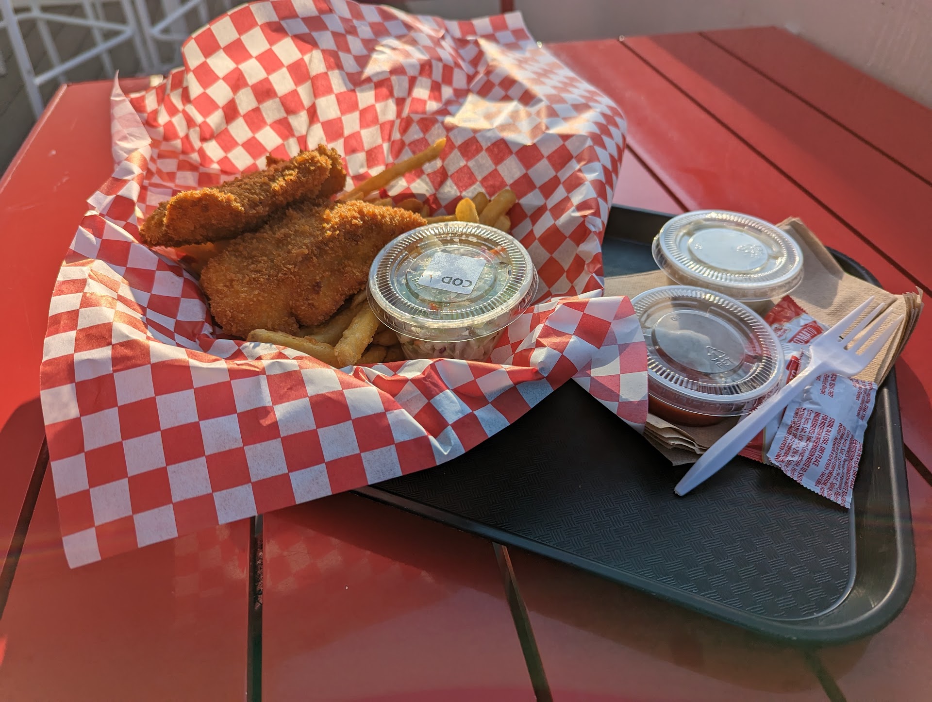 Read moreThe inside seating for the restaurant is on the second level and there is an outside on the deck seating on the second level as well. There is a great view of the harbor and breakwater as well from the second floor. I did not see handicap access (elevator) for the second floor. The food was exceptionally good. They had several different fish that they prepare as fish and chips (rockfish, Ling cod, halibut, albacore tuna, and salmon). All of the seafood is locally caught. My partner had half a Dungeness crab that was served with butter and coleslaw. I had the halibut and chips (French fries) in which you can tell that the halibut is fresh (not fishy tasting at all) and it is a generous three piece portion along with a heaping of fries. The prices are reasonable and and you can tell the fish and crab are fresh. The waiter was excellent as well as he made some good recommendations (recommended the ling cod but said to tey the halibut or salmon fish and chips if we have never tried them before) and was checking up on us to make sure we were satisfied with our food. After the meal we went to the seafood market and bought some smoked salmon along with two whole Dungeness crabs. The server packed them reallt well in ice to assure that the crab stayed cold for our long journey back home 6 hours away. I definitely recommend this seafood restaurant as it was the best meal we had in Westport. It is not fancy but it serves awesome food. I can't wait to come back and try the Ling cod...